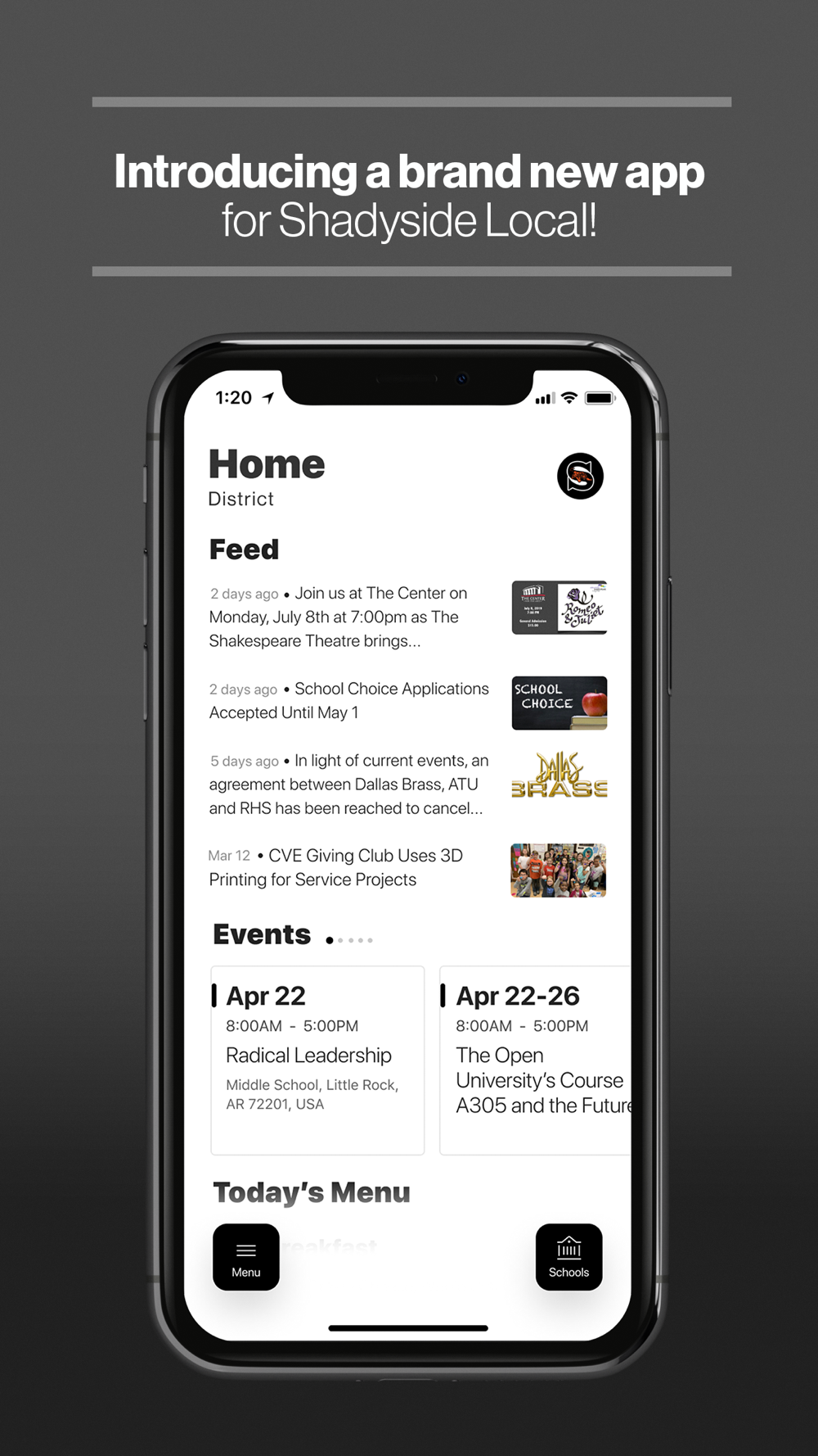 The event section shows a list of events throughout the district. Users can add an event to their calendar to share the event with friends and family with one tap.