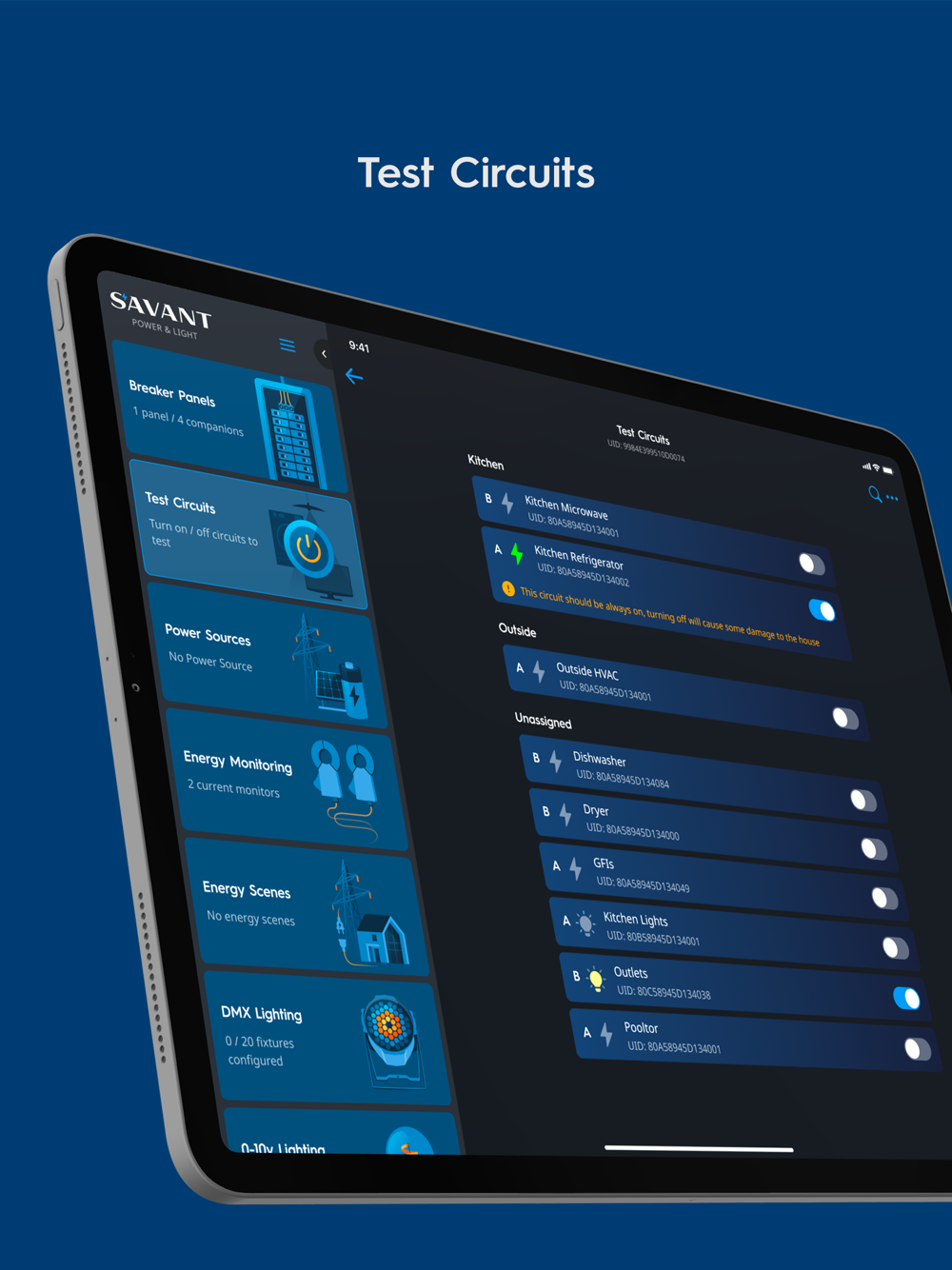 Offering a simple linear setup process for discovery, pairing, and configuration of controllers and Companion Modules for smart energy and panelized lighting, the Savant Power and Light app makes the deployment process easy for electricians and Savant Integrators alike. The app also features the ability to test functionality directly after configuration, right from the app - reducing required time on site.