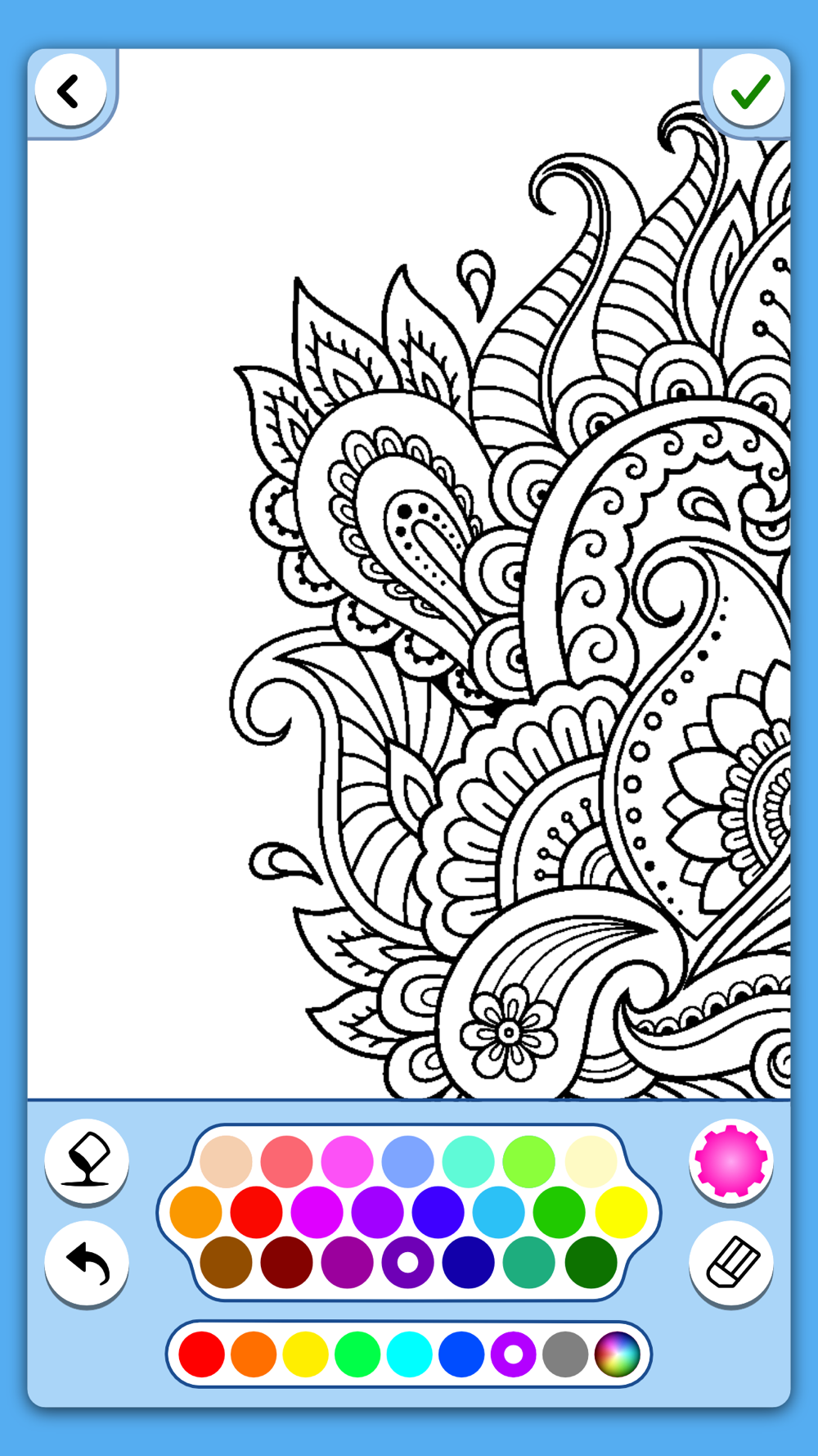 Offriamo molti tipi diversi di pagine da colorare. In questo modo avrete sempre molte pagine da colorare che si adattano alle vostre esigenze. Che sia facile o complicato quello che preferisci, in questa app abbiamo riempito molte categorie con diversi livelli di difficoltà.