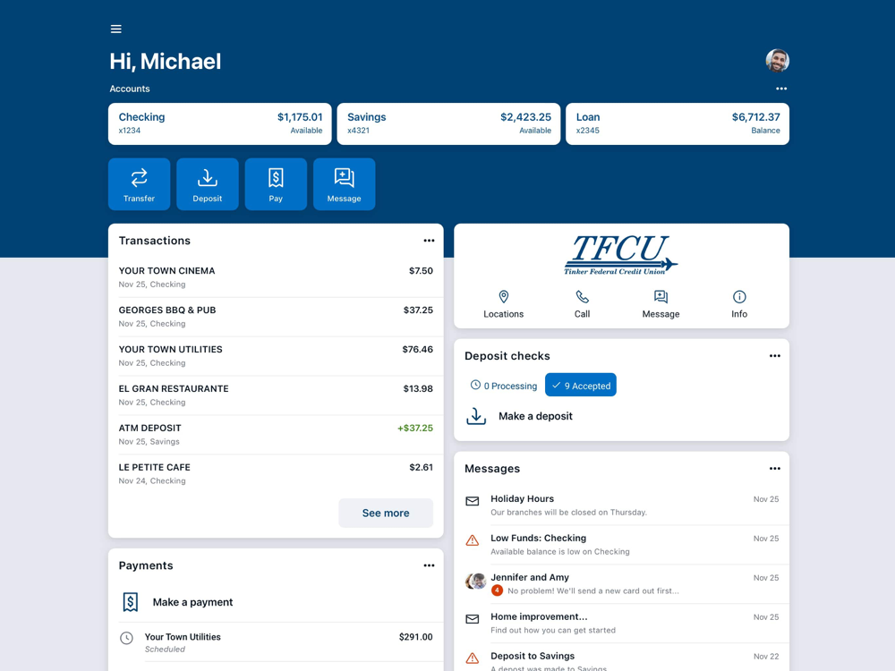 Convenient, fast, secure and free. Managing your accounts through Tinker Federal Credit Union’s app allows you to check balances and transaction history, transfer funds, deposit checks, make loan payments on the go and more.