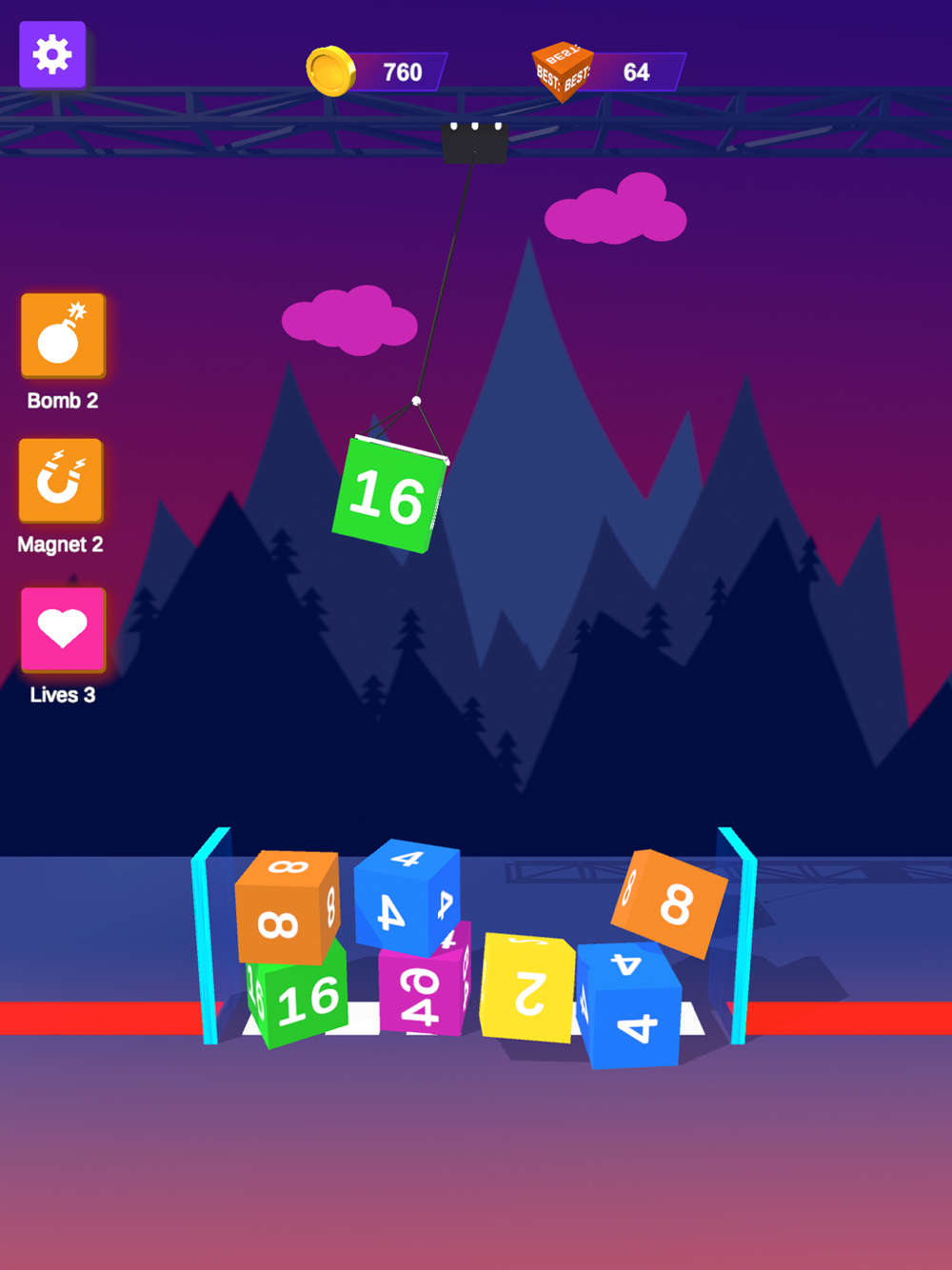 In this fun puzzle game you need to collect cubes to get the number 2048 or more. Open new blocks but watch out for lava. It is based on the favorite game 2048 and the crane from City Bloxx. Open 3 types of cubes, good luck!