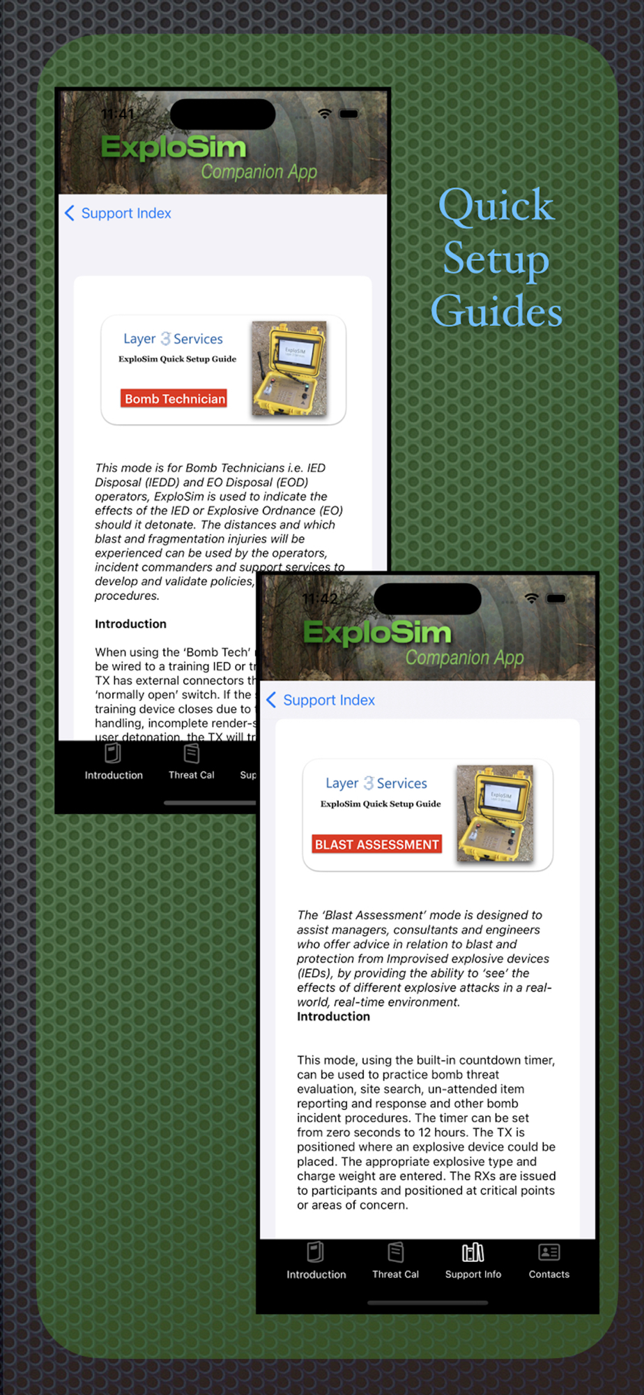 The ExploSim Companion App is used to plan scenarios for the ExploSim system by Layer 3 Services. ExploSim shows the real-world, real-time effects of an explosion without damaging buildings or killing people. The system provides a safe emulation of blast and fragmentation effects using radio frequency energy. ExploSim is designed to train: Bomb Technicians, EOD Operators, Search and Assault teams, First Responders, Building Marshals and Wardens, Security and Emergency Managers and consulting engineers. The user can select from 25 explosives and from 0.1 to 22,000 kg (~2 to 44,000 pounds). When the system is triggered, the receivers show, via LEDs, if they are in range of lethal blast, blast injury, fragmentation injury and significant structural damage.