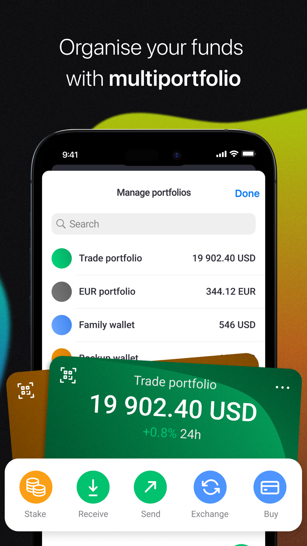 Manage crypto with maximum convenience! With this feature, you can create multiple wallet portfolios – each with a specific set of crypto assets – and tailor them to your needs.