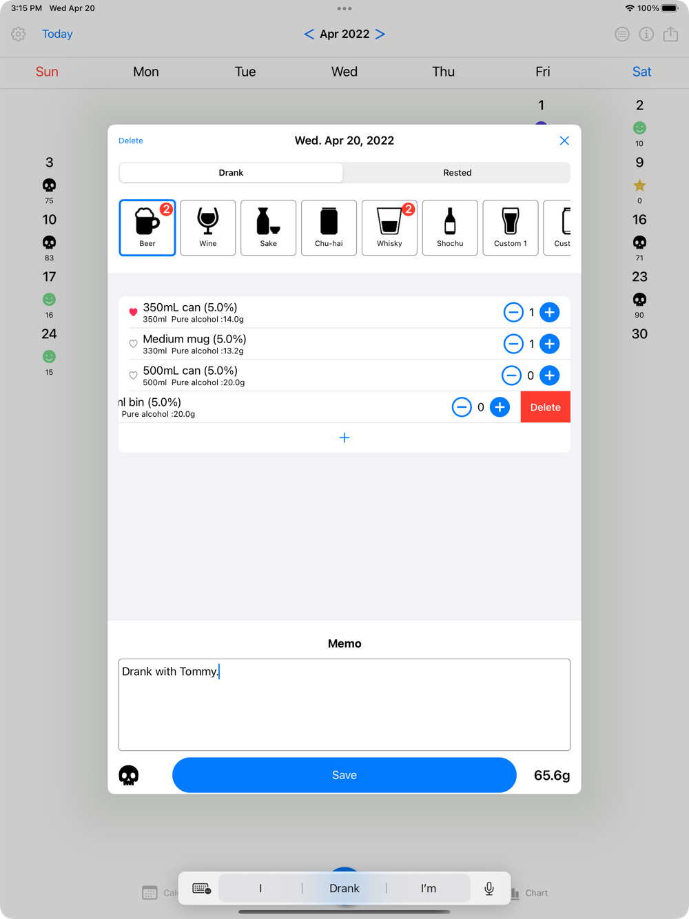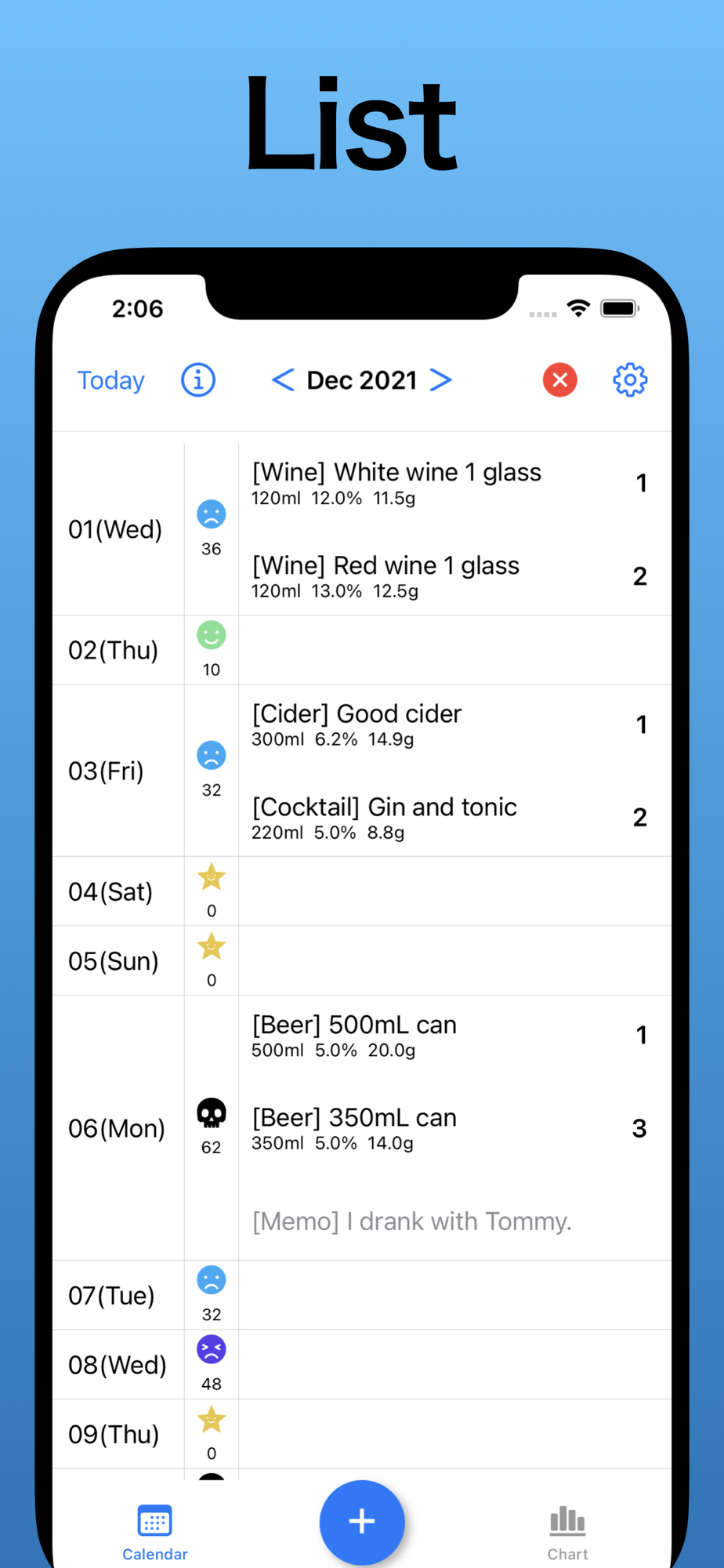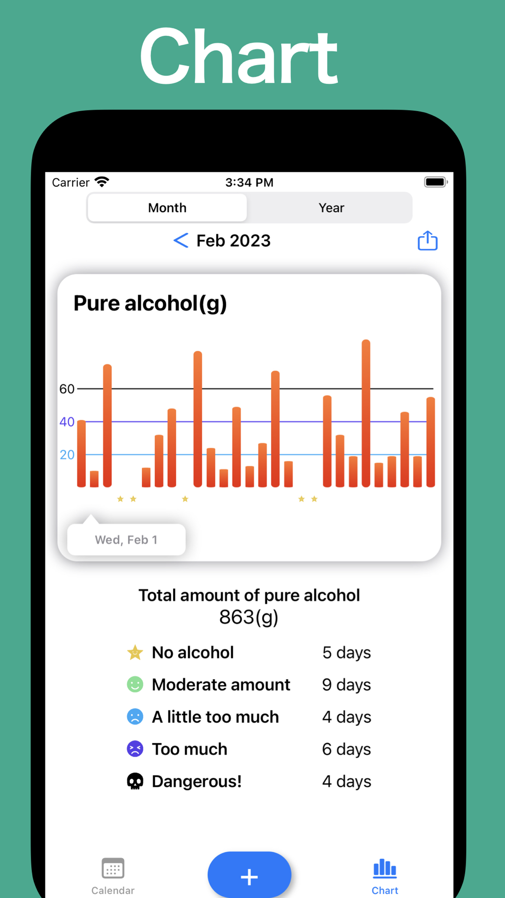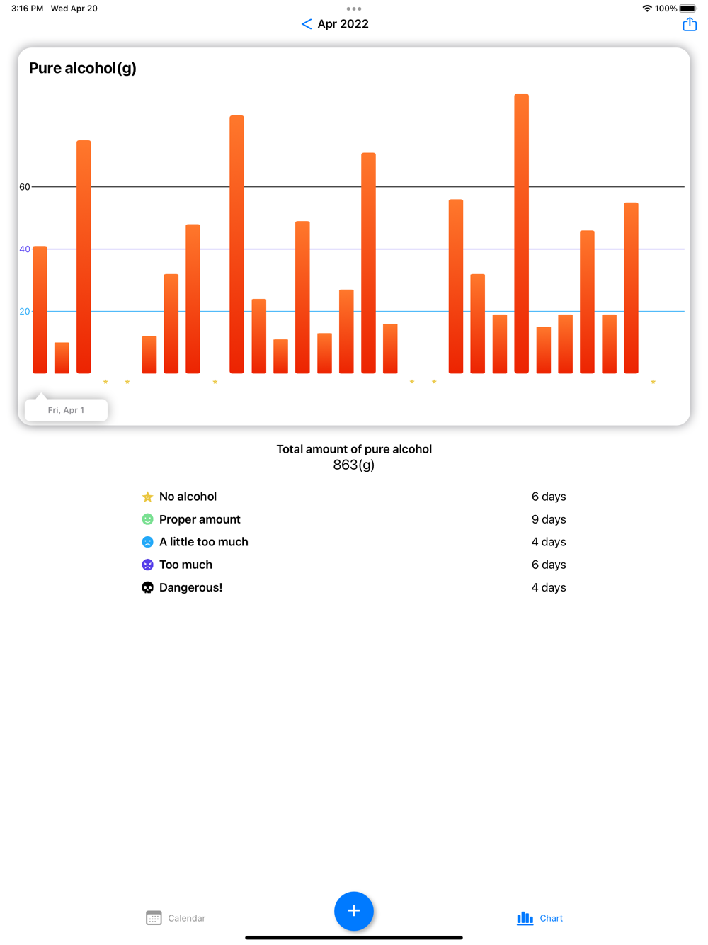 When you enter the alcohol you drank, you can calculate the amount of pure alcohol and display it on the calendar and the chart.