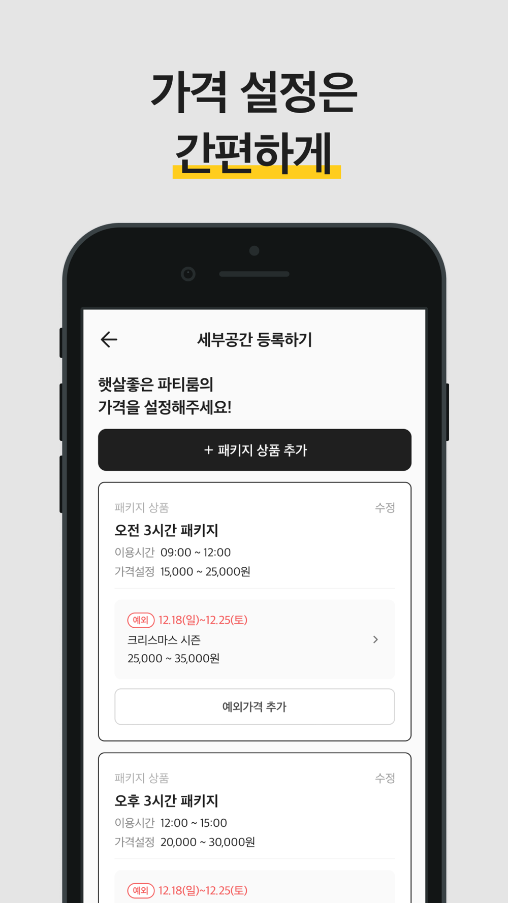 - 호스트님의 편의에 따라 패키지 요금, 시간제 요금을 선택하여 공간 상품을 등록하실 수 있습니다.