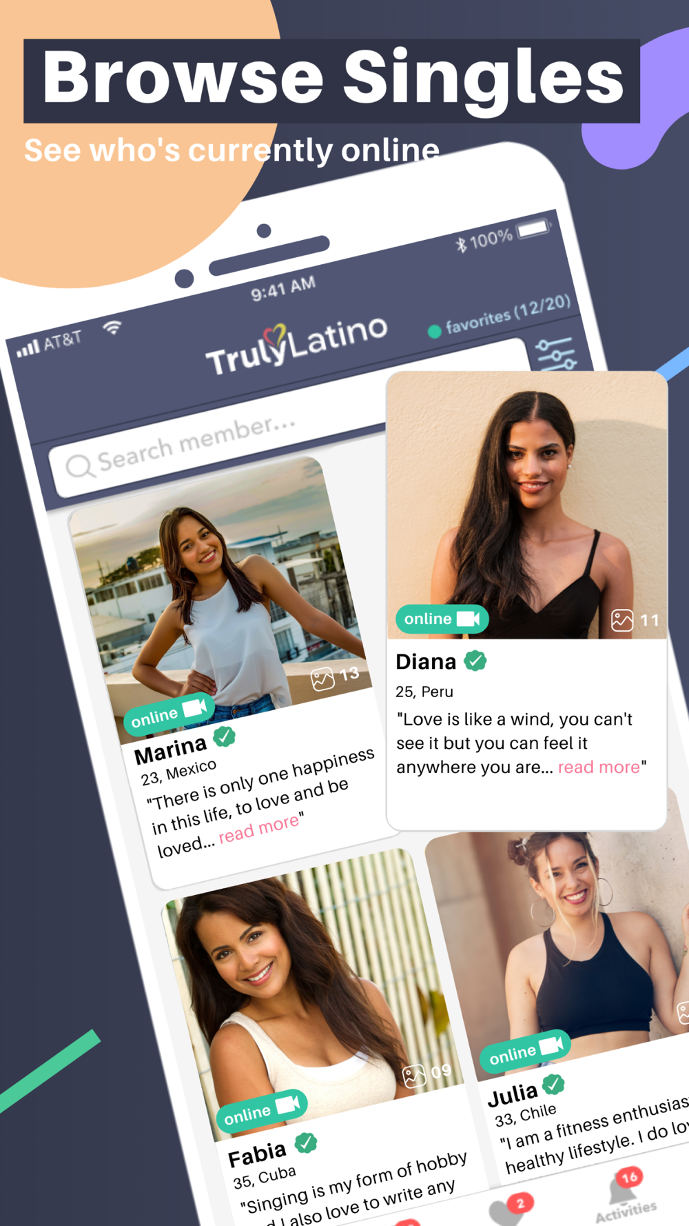 The best Latin dating app. TrulyLatino continually connects people throughout the world with Latin singles from the USA, Mexico, Brazil, Colombia, Peru, the Dominican Republic, Venezuela, Ecuador, Chile, Argentina, Puerto Rico, Cuba, and many more Latin countries whenever and wherever. With a large and curated user-base, whether you’re looking for serious relationships or marriage, you’ll surely find your perfect match here.