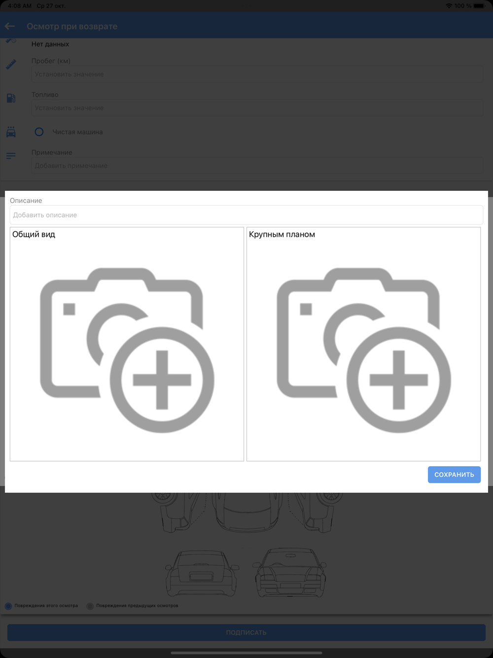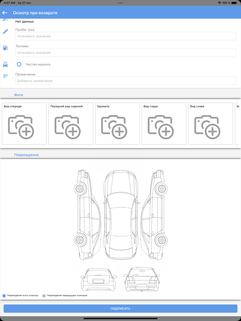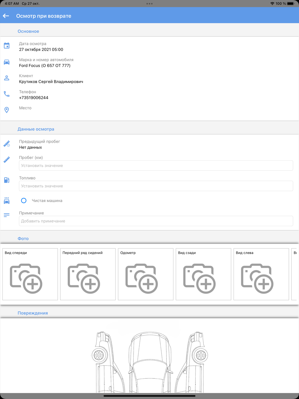 При проведении осмотра заносятся данные о состоянии автомобиля на момент проведения осмотра: пробег, чистота и список новых повреждений. Так же можно увидеть информацию о прошлых повреждениях. В осмотры и повреждения добавляются фотографии напрямую с камеры устройства. По завершении осмотра акт подписывается графической подписью.