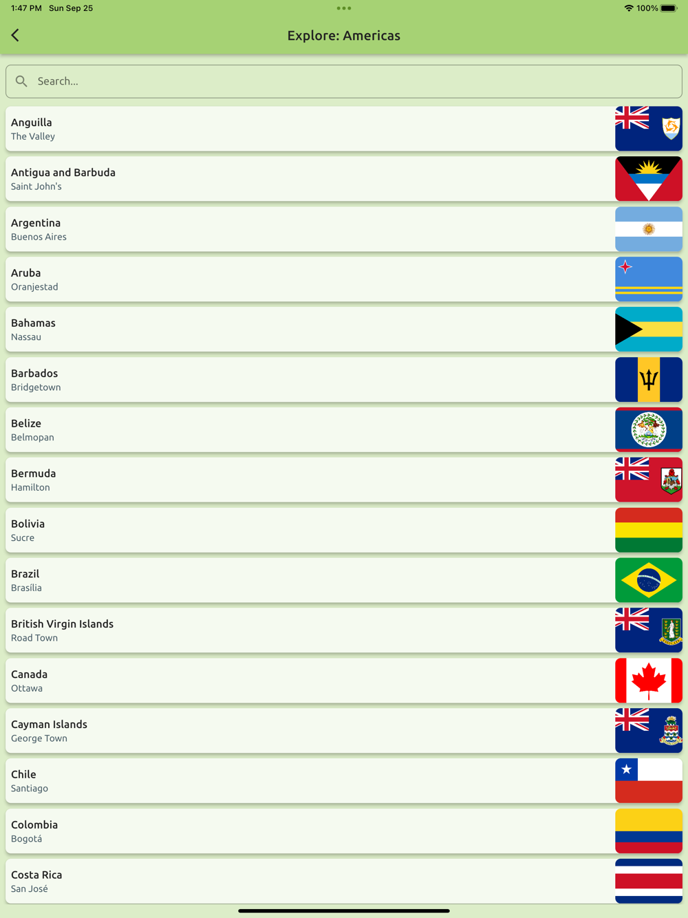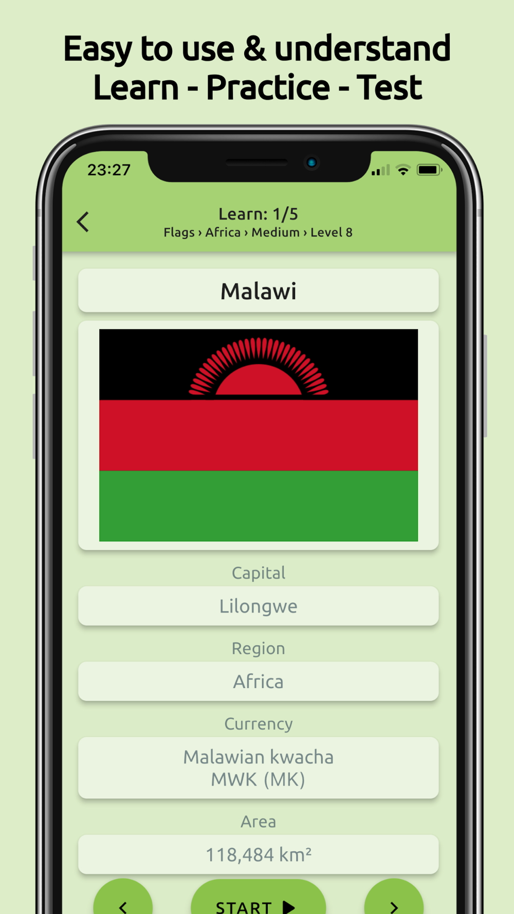 - You decide what to learn: choose from flags, capital cities, maps and locations on the world map, and currencies.