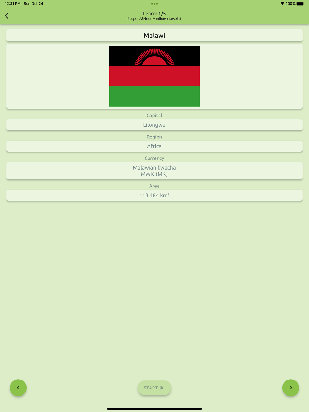 Each level is designed to teach what you choose to learn (flags, capitals, maps, etc.) of only a small number of countries. Make sure you memorize the information before you start a level.