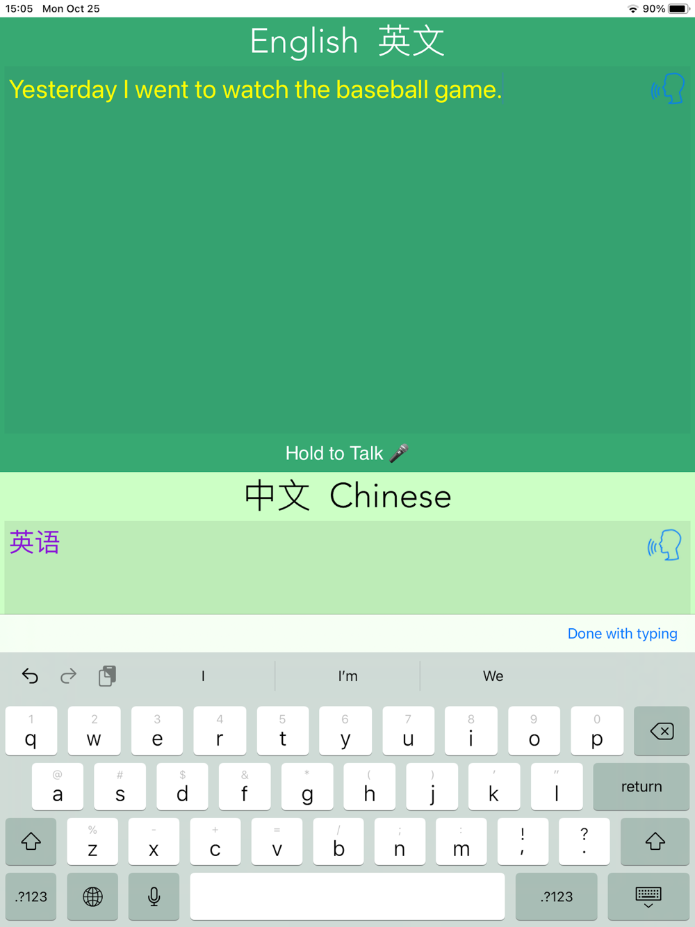 This app provides realtime translation between Chinese and English. User can talk or enter content in Chinese or English, and then the translation is done immediately. The translation result is displayed and spoken out.