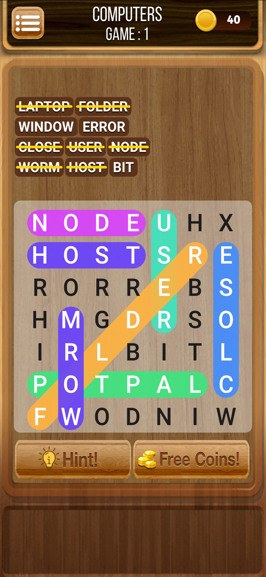 Hidden Words Search is completely FREE to play, concentrate and have fun guessing and finding words.