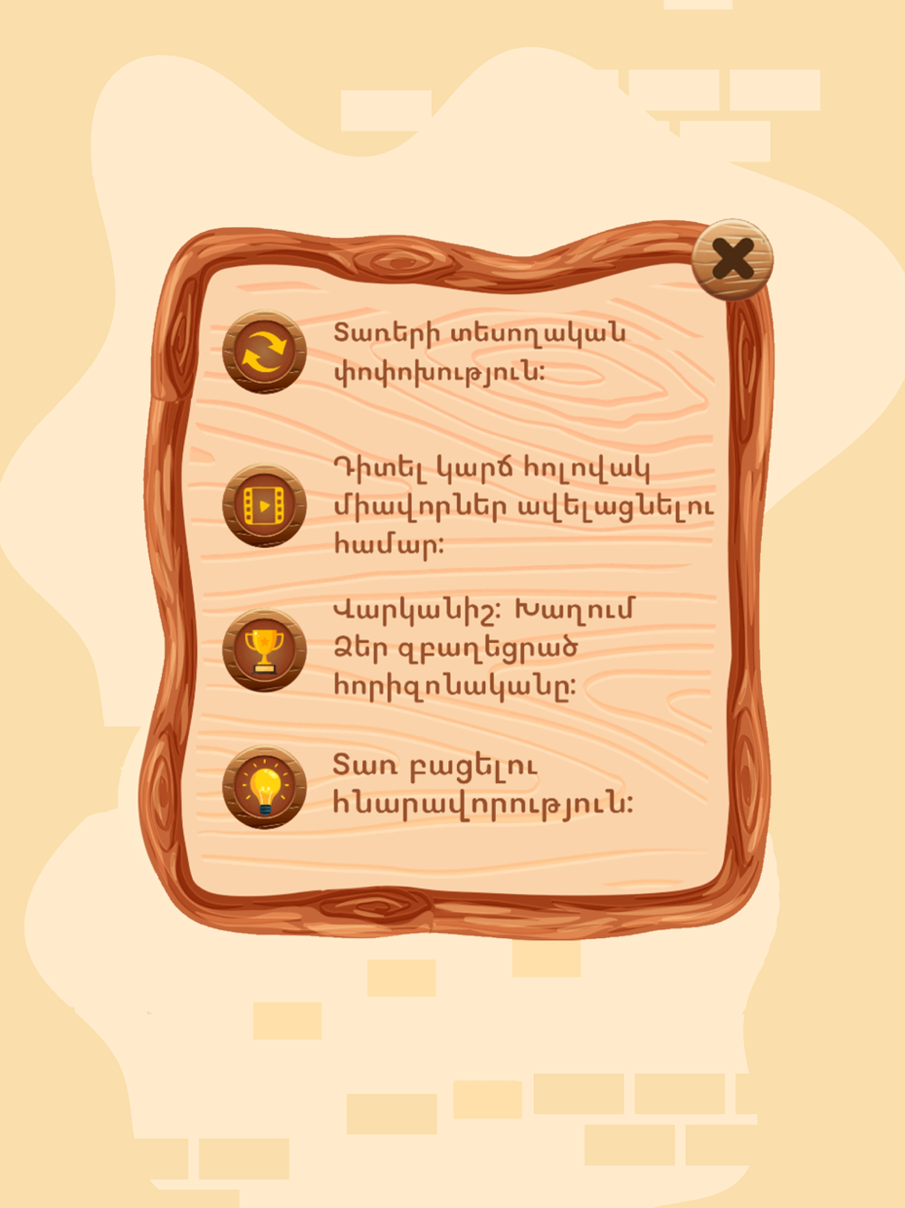 "Gtir bary - baraxax"- Armenian puzzle, it will help you think faster and more flexibly. How to develop agility, remember forgotten words and learn a number of new literary words. If you find any mistakes in the game, write to our e-mail address: