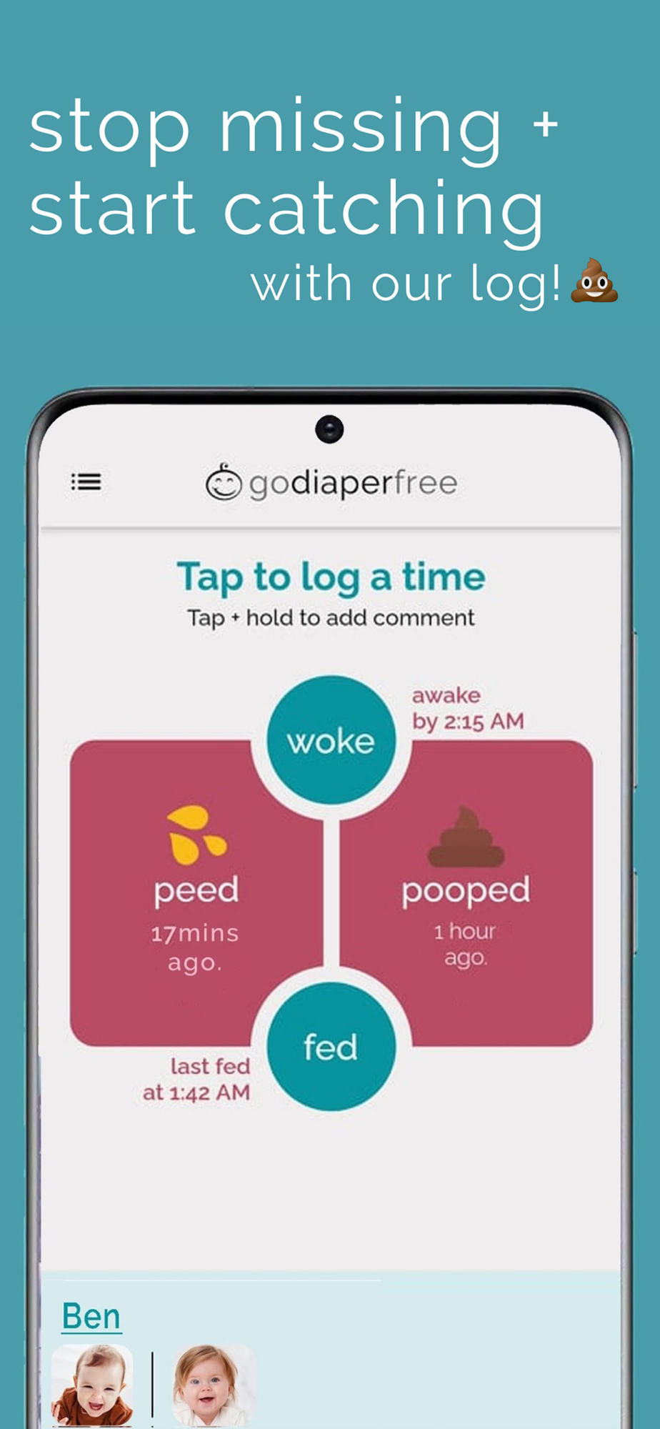 Developed by me, Andrea Olson, author of Go Diaper Free and The Tiny Potty Training Book, whose 5 children were all out of diapers by walking, none requiring potty trained…a mom who has hardly had to change a poopy diaper and has saved over $10,000 in diapers across their babyhoods…you’re in good hands when it comes to observing your baby for elimination communication. Learn more at godiaperfree.com or via the app, itself.