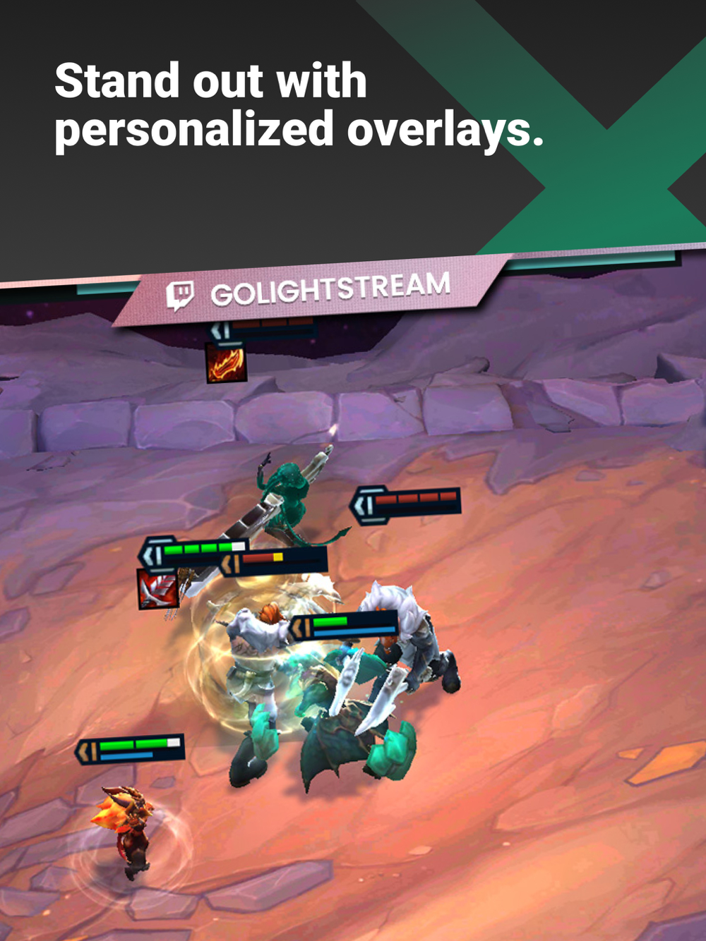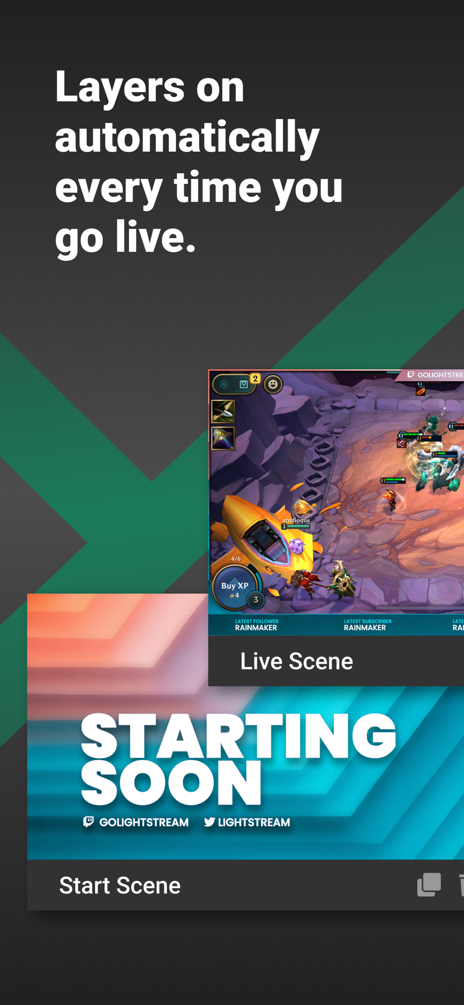 Lightstream MobileCast is a companion app for Lightstream Studio. The app captures your device’s screen and sends it into your Lightstream Game Source layer. In Lightstream Studio, personalize your stream to engage your audience and stand out from the crowd with stream overlays and alerts that layer on automatically every time you go live. Keep it simple and stick to a single starting scene – or take things to the next level by using a desktop or laptop to switch between layouts on different scenes.