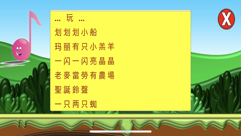 选择一首童谣并在手机屏幕上显示的乐器上演奏,并带有要按下的键的视觉指示。 同时,童谣的文字以卡拉OK的形式在屏幕上播放。