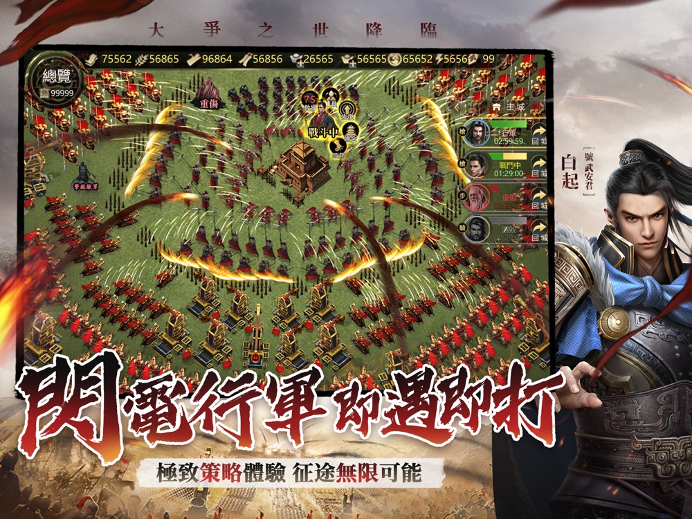 《大秦帝國》經典巨著改編,正版IP授權,這是一款超快節奏的SLG手遊,你將告別慢行軍或回合制戰鬥。真實的戰場演變,很大程度上倚賴於你的戰術和操作,你的每一步操作都可能逆轉戰局創造無比真實的戰爭臨場感。現在,一起重返戰國、招兵買馬、開基立業,和千萬玩家在超大沙盤中縱橫捭闔,大殺四方!