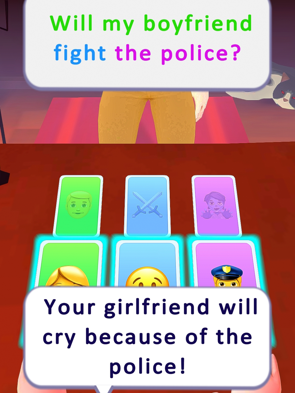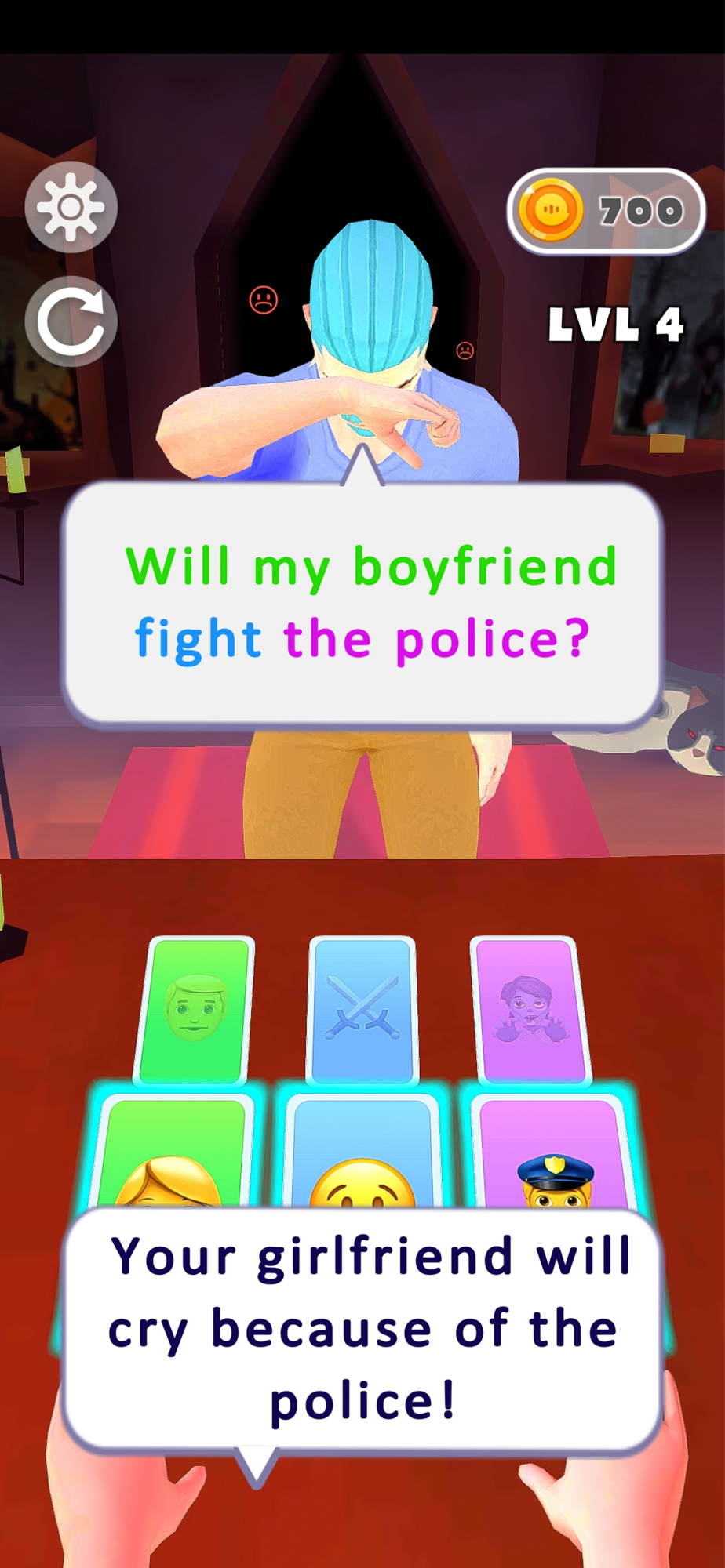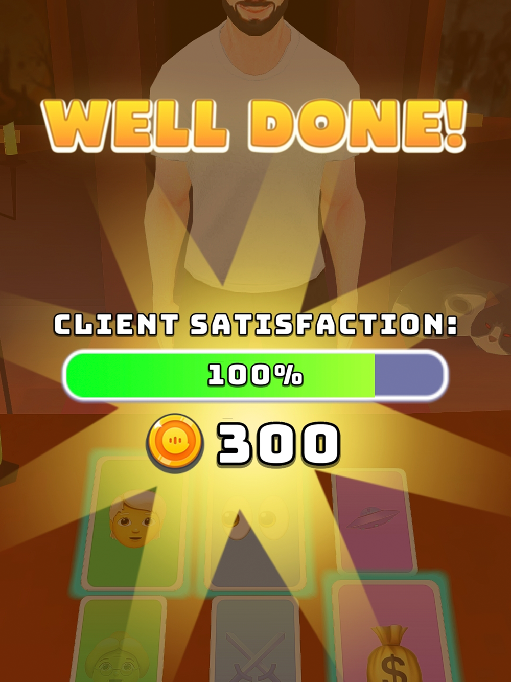 At each level, a new client joins you. You lay out emoji cards on the table. The task is to match the cards to the answer so that the visitor remains satisfied.