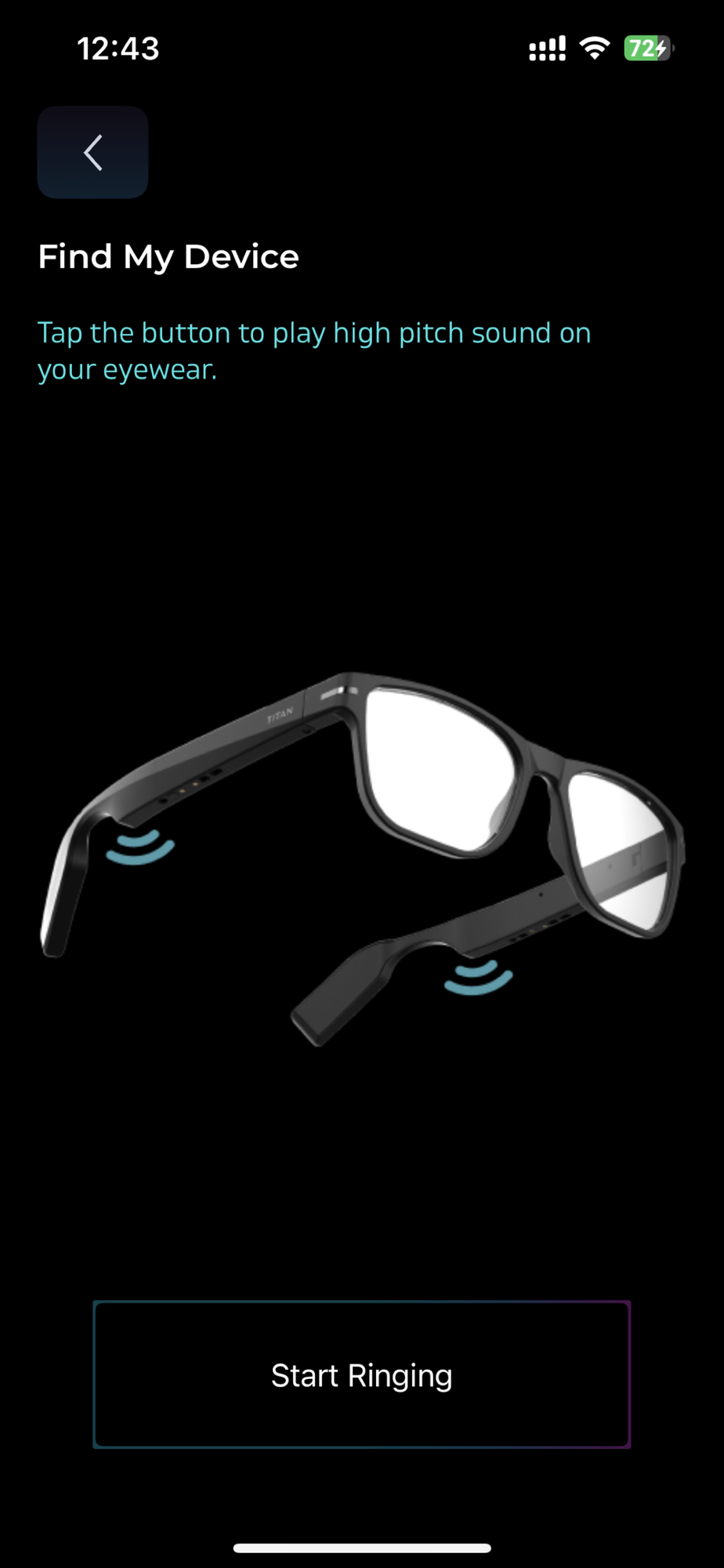 The device comes with Bluetooth 5.0 device with dual mode classic and BLE connections to phone. The classic connection supports wide-band high-quality audio for Call, Music and Voice assistant functions. The BLE supports data communication with the connected phone for pedometer data, phone remote functions (call reject, call mute, music control, find-phone and camera selfie control). The switchable temples communicate with each other without wires by using Bluetooth True Wireless (TWS) technology. The device has a range of 30+ft to the phone.
