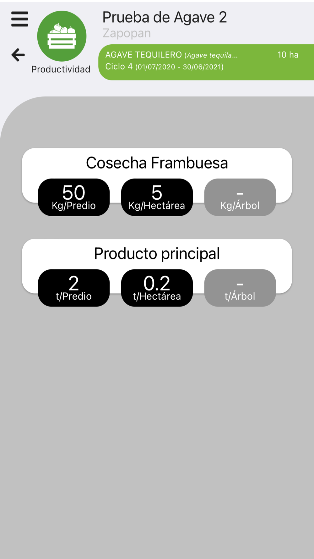 Aplicación móvil para equipos portátiles que permite visualizar toda la información relacionada con cualquier predio y ciclo agrícola en particular, como el perfil agroecológico del predio, el clima histórico, presente y pronóstico, su imagenología, agenda, bitácora, presupuesto, flujo real, etc.