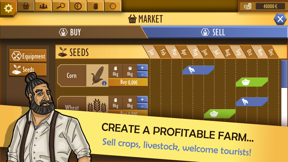 As the farm's head manager, you're in charge of affecting various tasks to your employees! There's loads to do: sowing seedlings, feeding your animals, cleaning, fertilizing, and even entertaining tourists! Careful not to overwork them though, or your farm's social score may suffer...