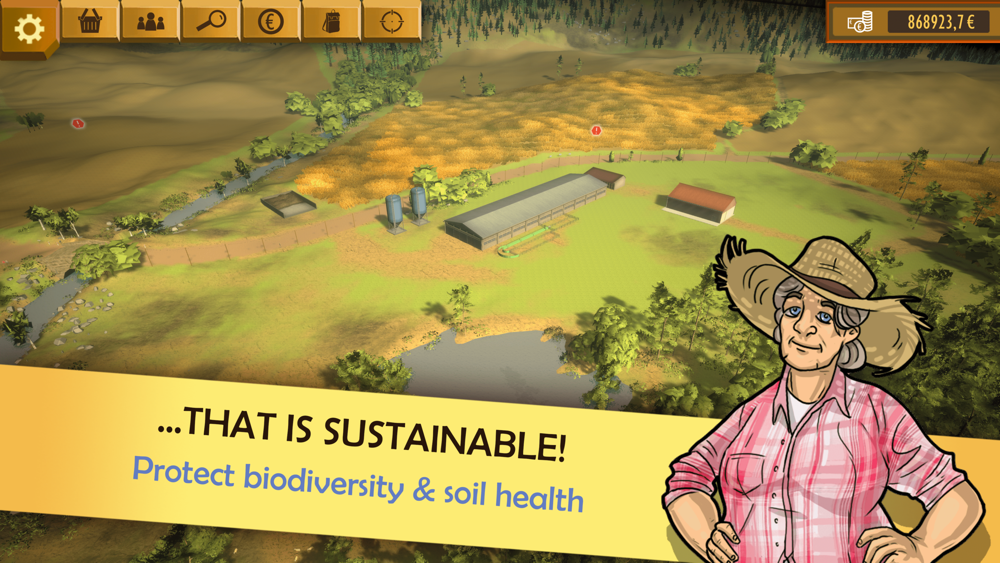 To achieve a truly sustainable farm, you'll need to balance your economic, environmental, and social scores. They are affected by every decision you make on your farm so think twice before using synthetic fertilizer or going into too much debt!