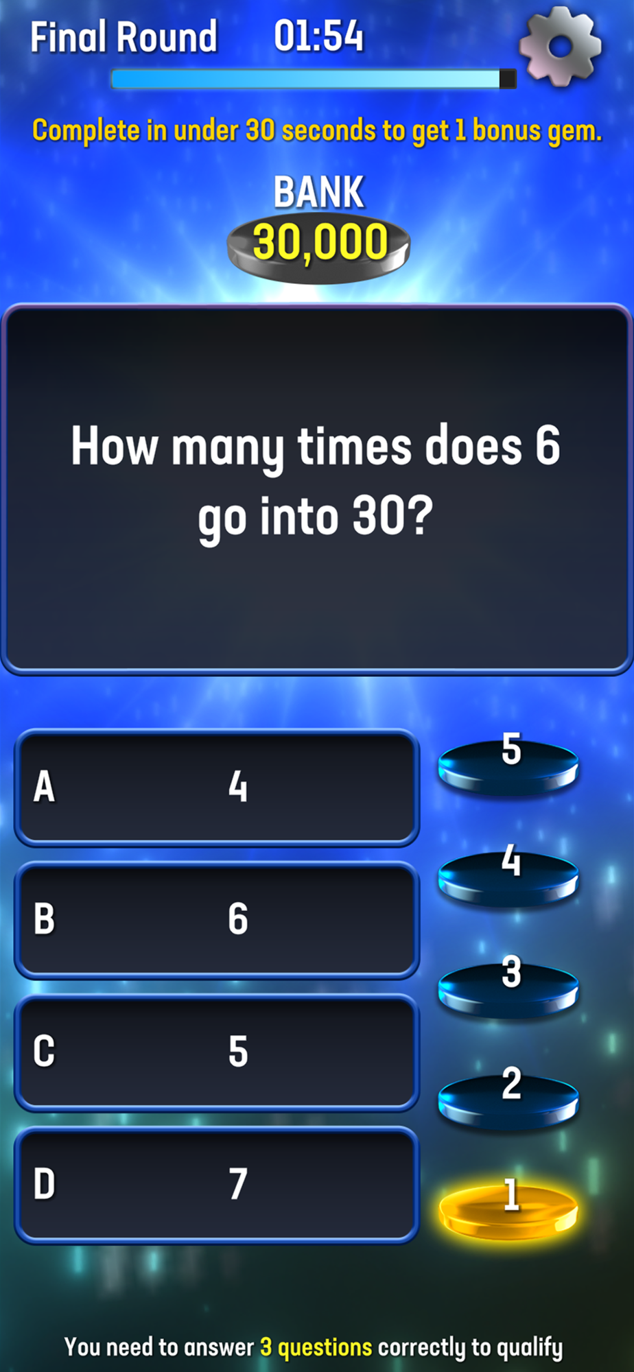 - Achieve gems by completing rounds quickly or getting 5 questions right in a row.