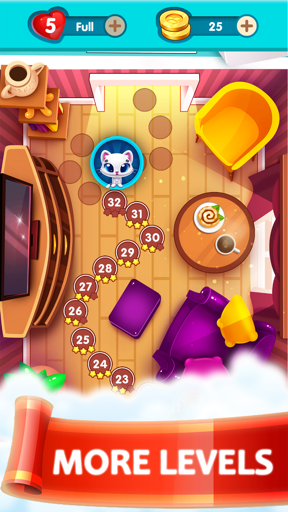 solve the puzzle and complete the challenge by matching 2 blocks to smash them, and collect tons of colorful toys and candy to enjoy the journey with your lovely cat