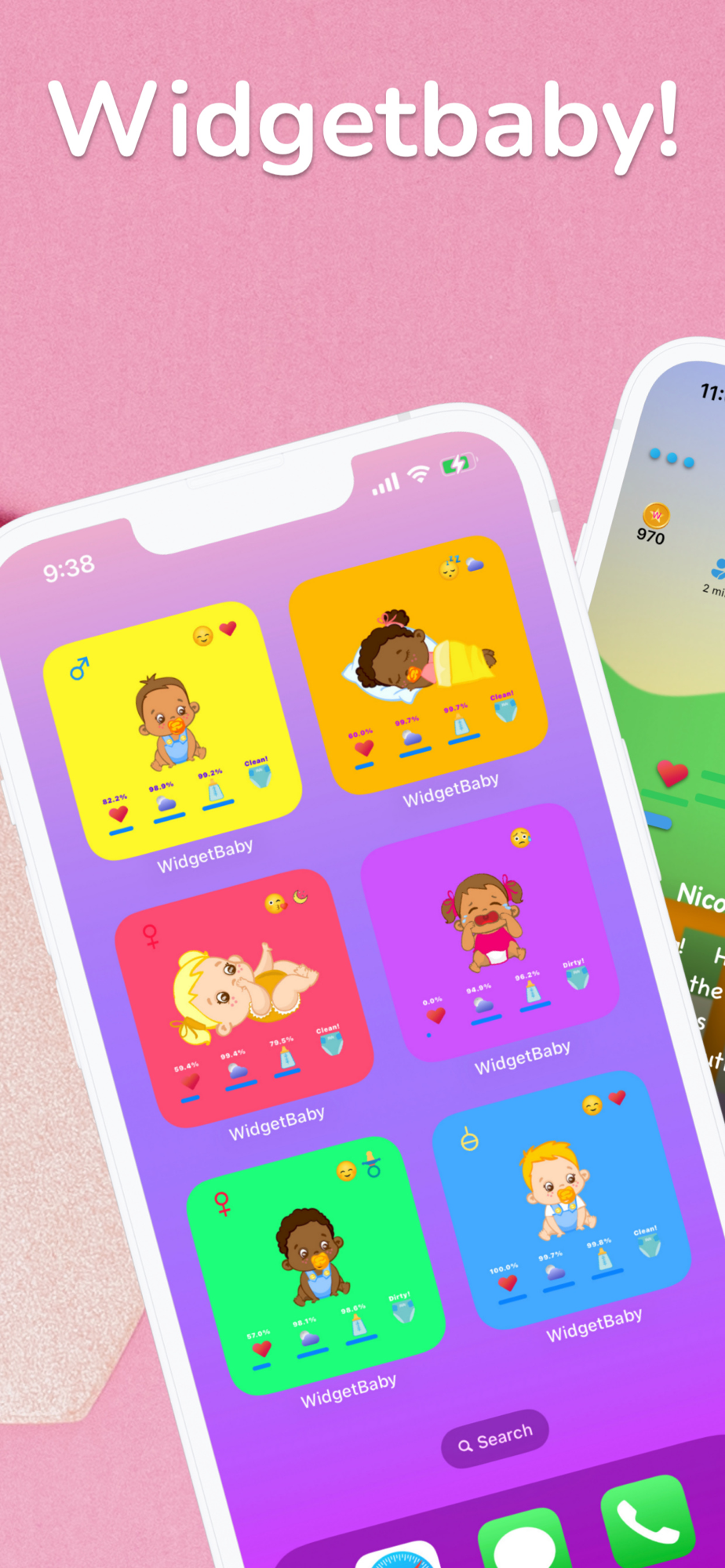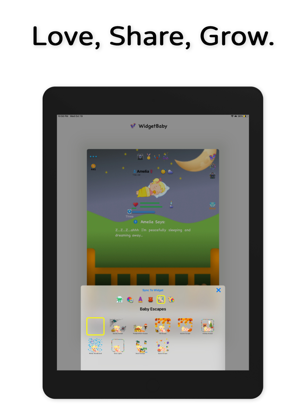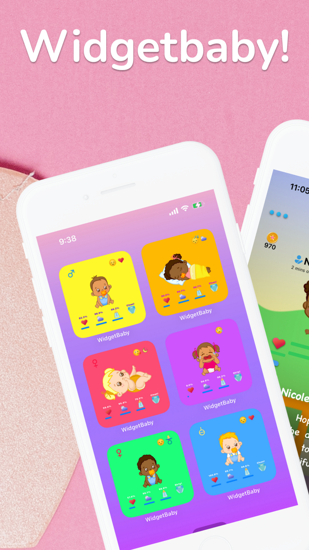 • Give your widget baby hugs and kisses by just swiping your finger across them in the app, or give them a toy or some soothing to boost their love level when needed.