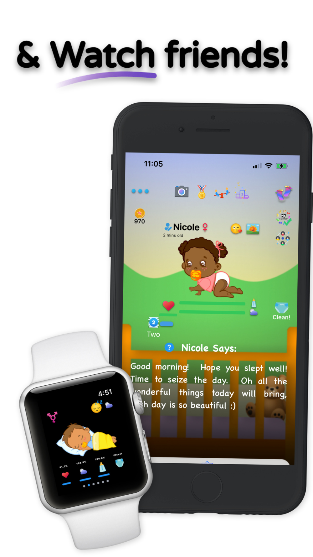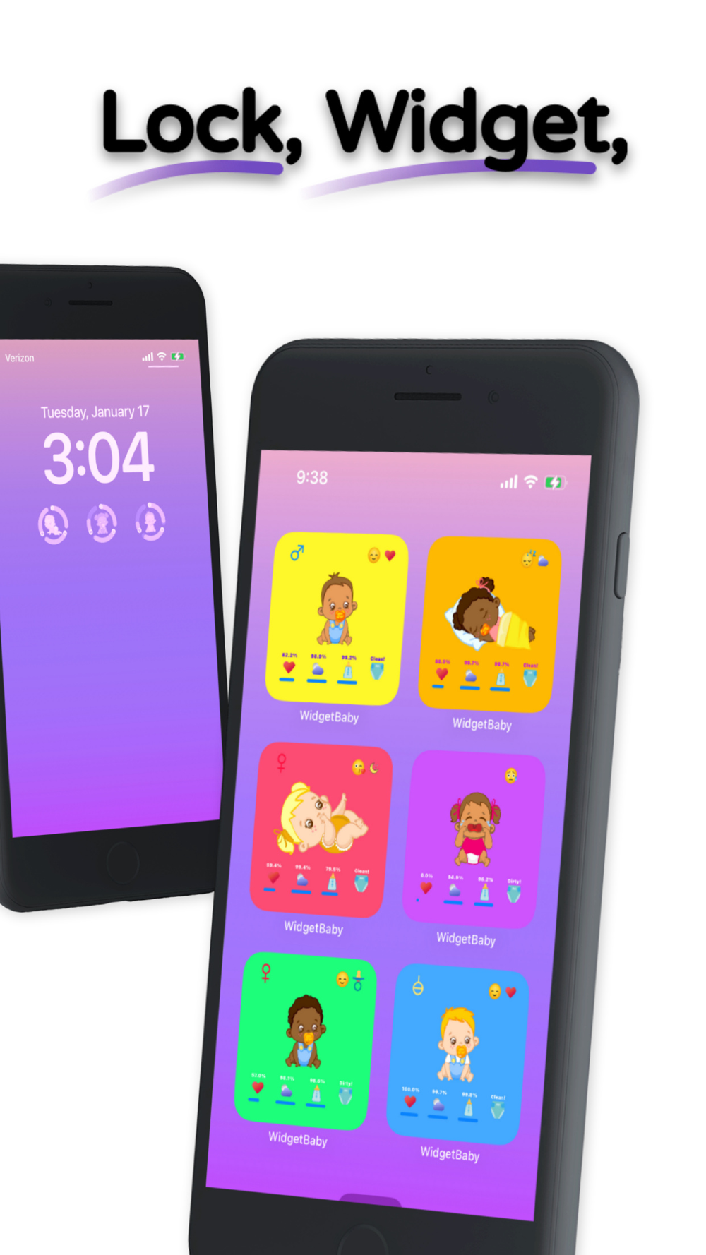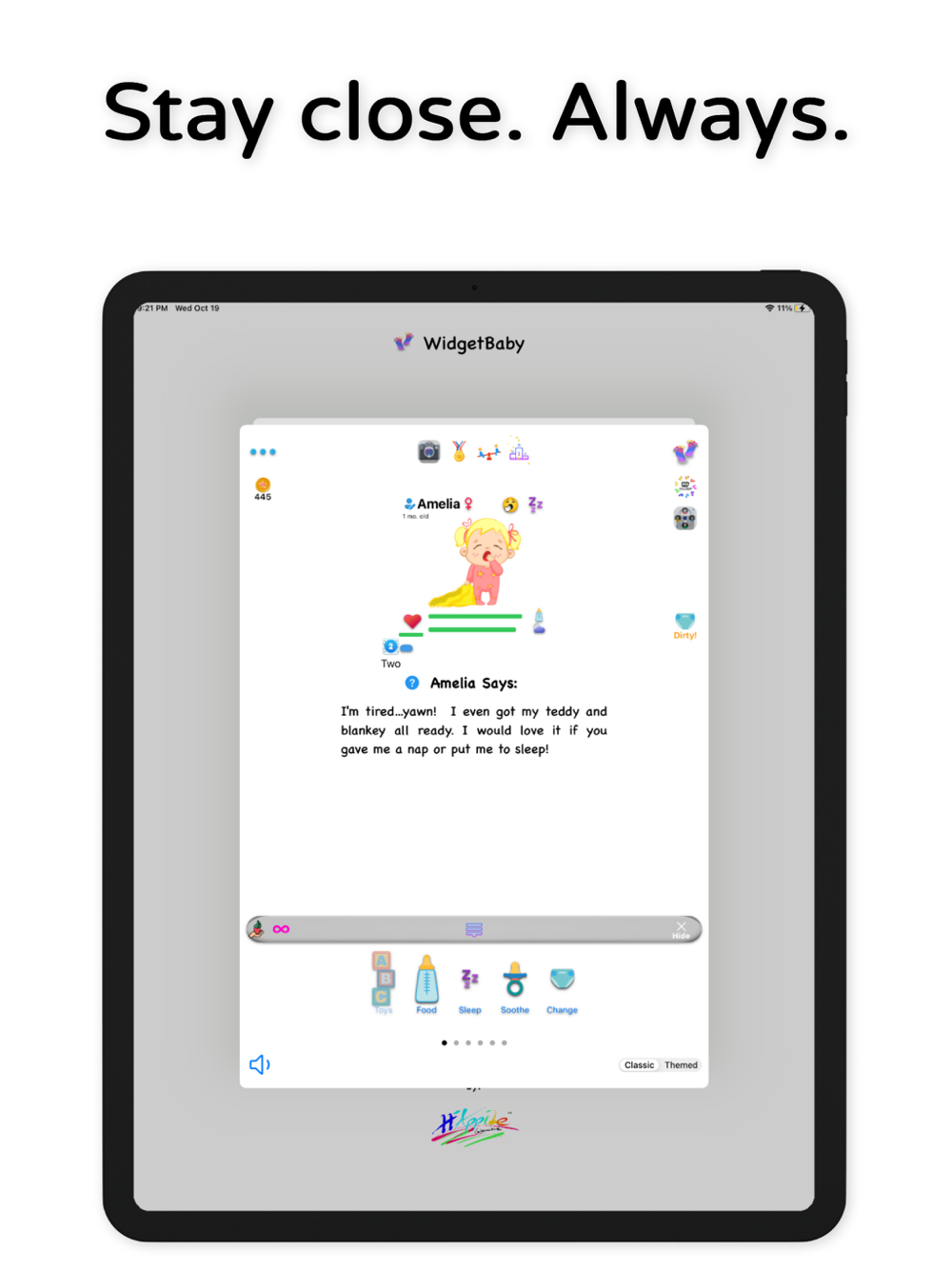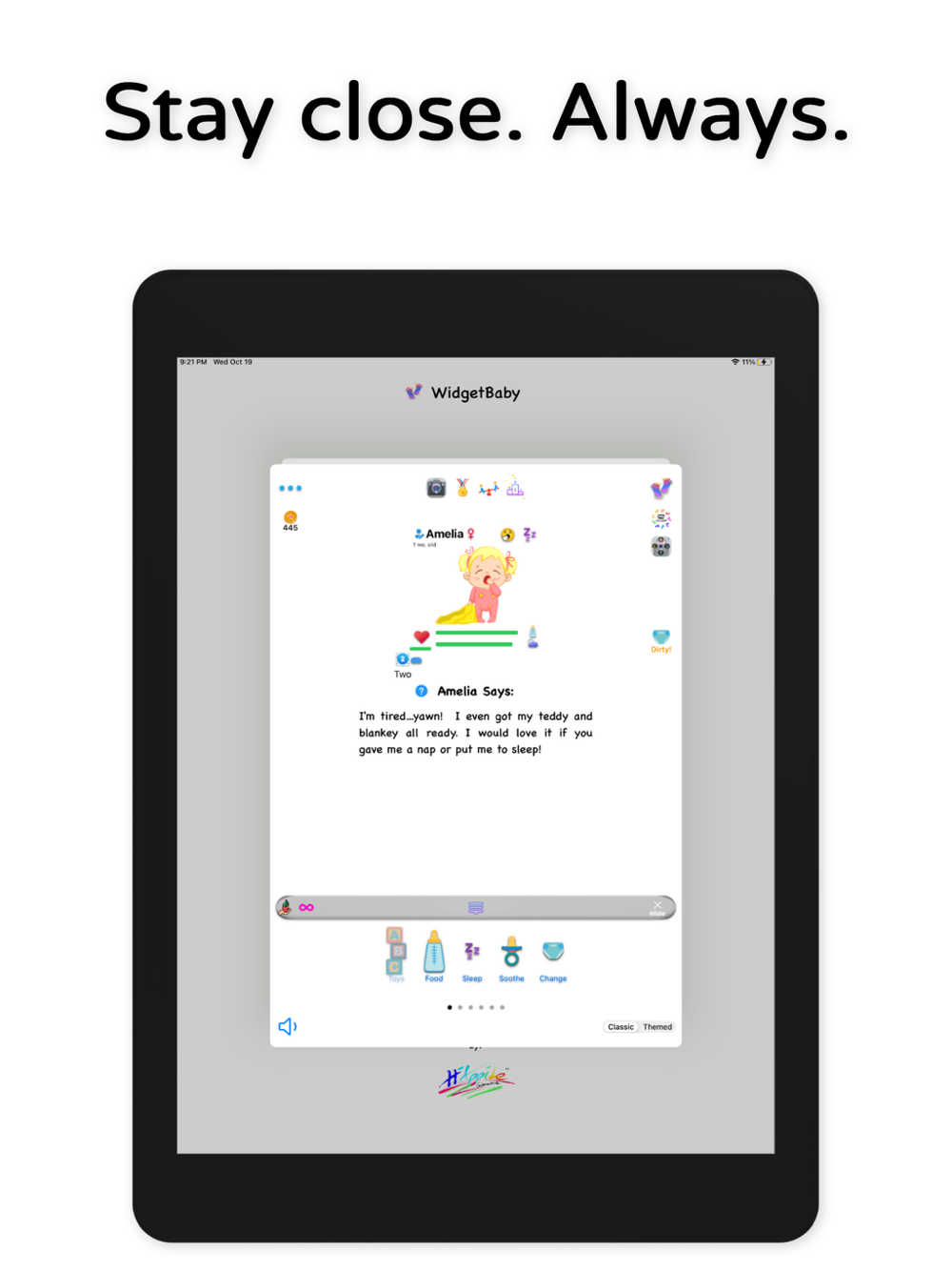 • Track your widget babys' health stats and provide food, sleep, and soothing as needed...don't forget to check their diaper too!