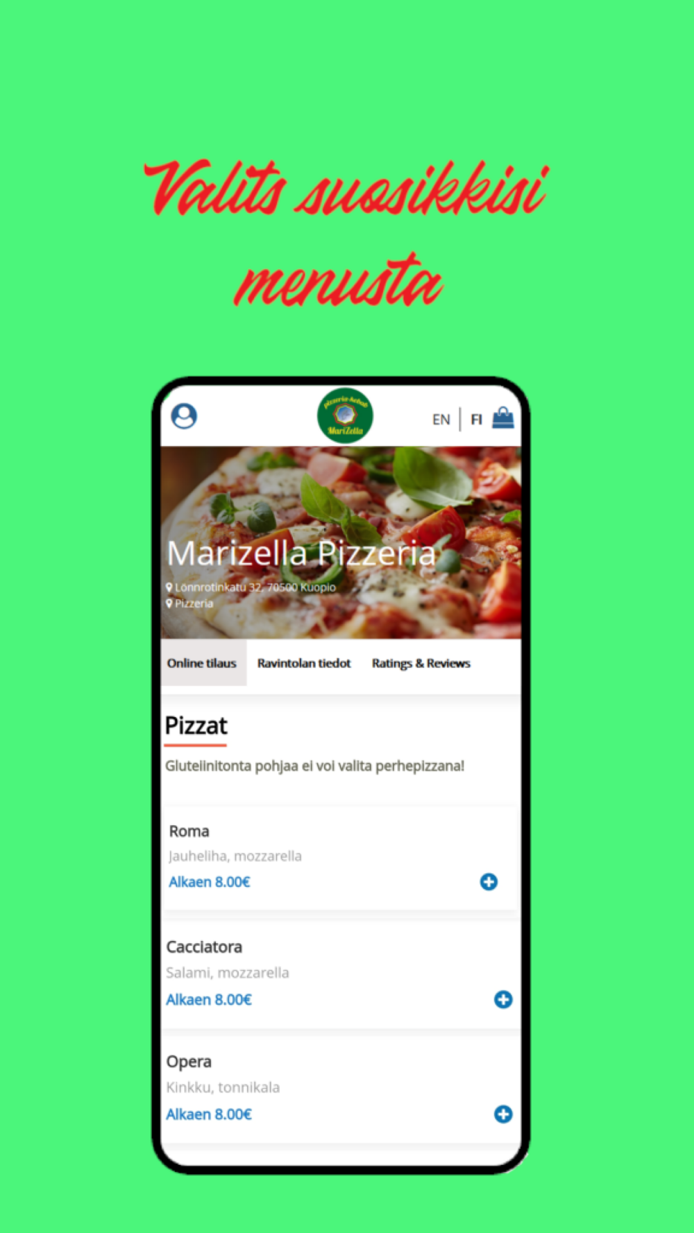 Marizella Pizzeria, sovelluksesta löydät kaikki ravintolan valikoimat edullisesti ja parhain tarjouksin! Voit tilata ennakkoon, noutaa ravintolasta tai nauttia kotona. Sovelluksen avulla apu löytyy parhaiten jokaiseen tilanteeseen.