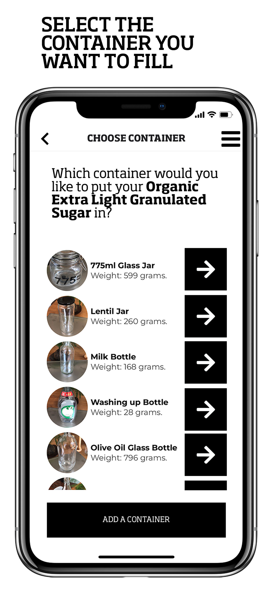 - Fill your container and set it on any of our scales