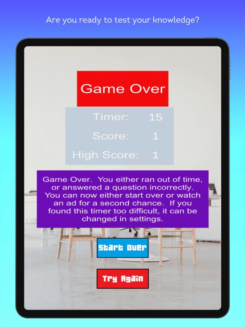 A limited amount of time is given to answer each question, to add challenge and excitement to the game. This timer can be adjusted in the settings menu.