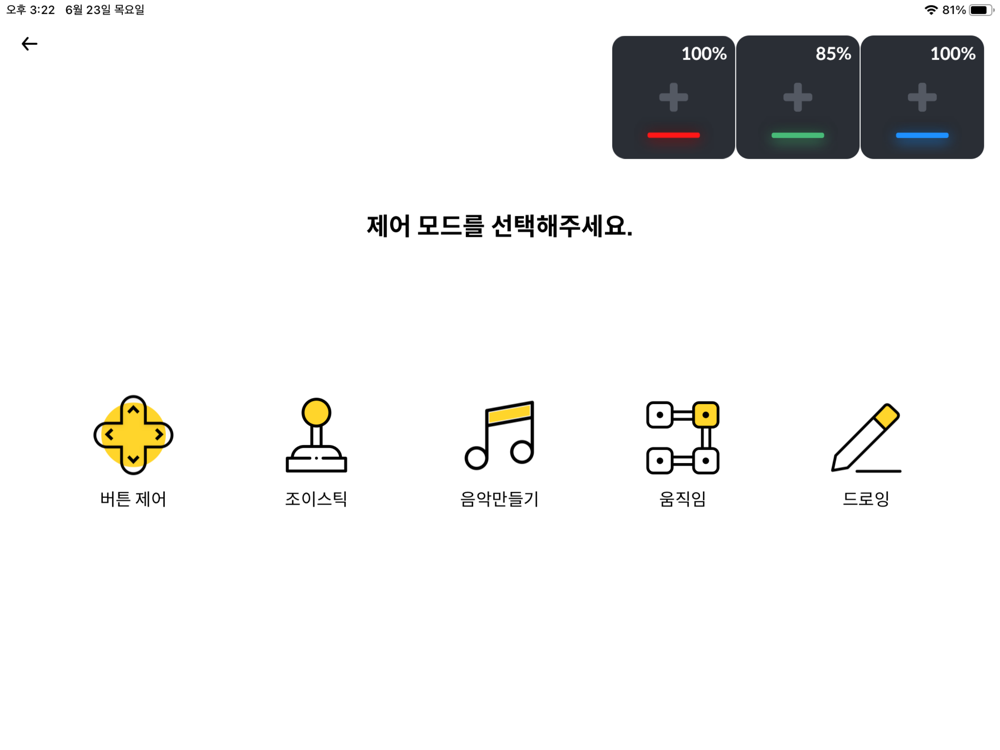 The Bcoding app provides various functions such as buttons, joystick, music mode, and motion making.