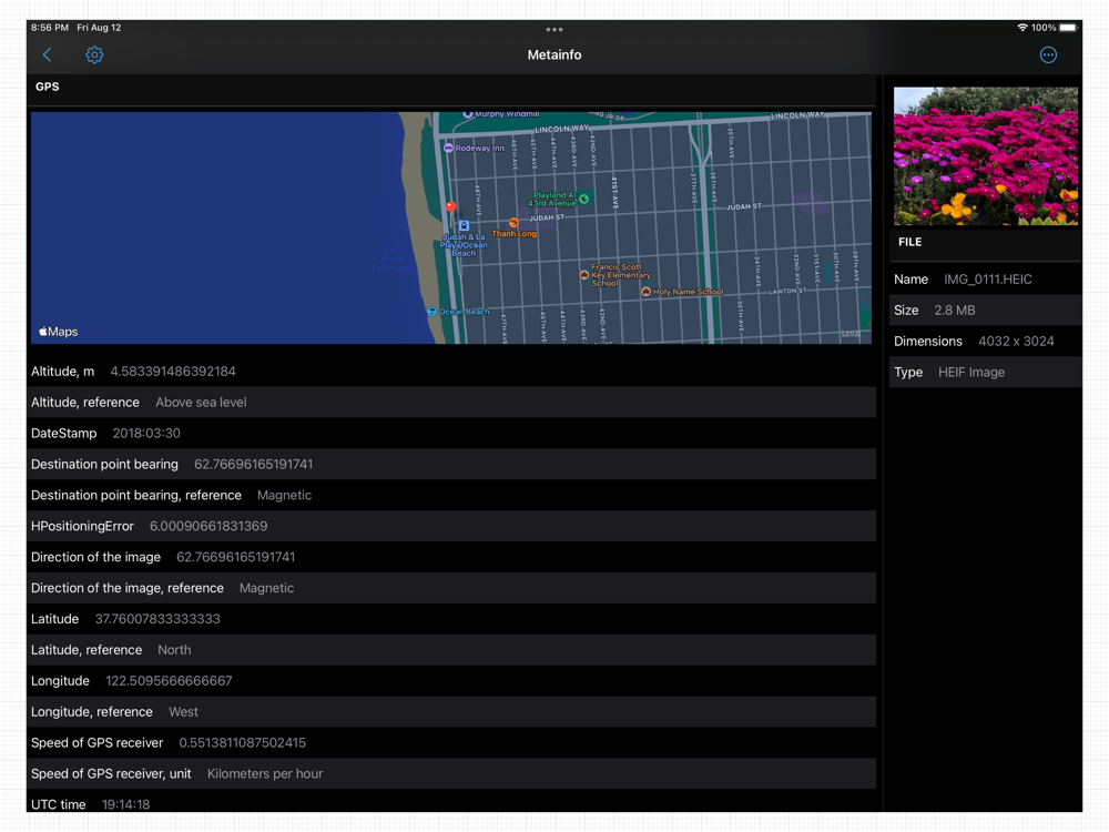 - Metainfo can operate with files opened via Files app. It can't open Galleries and Photoalbums.