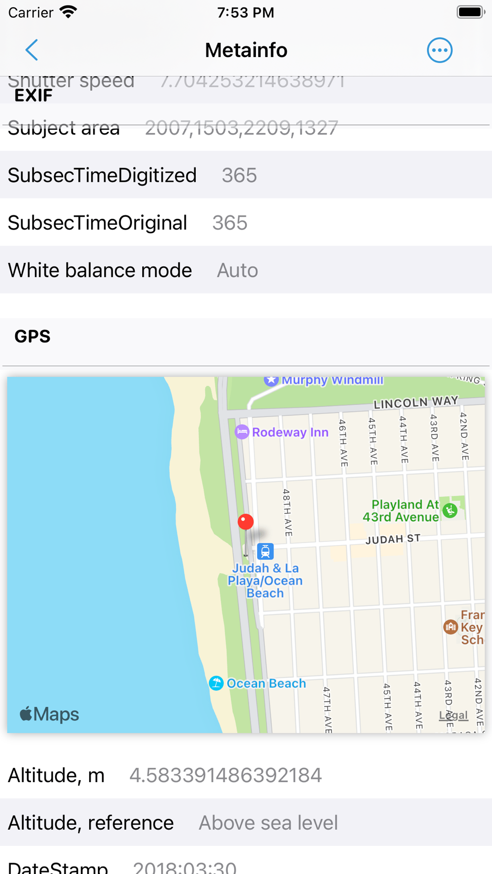 Metainfo is a metadata viewer and it helps you to extract EXIF information from photos, such as GPS location, camera settings, copyright settings, time and date and so on. Additionally it can open media files to view album cover, ID3 tags if any and shortly about used bitrate and codecs.