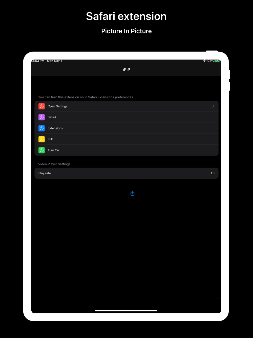 Video Picture In Picture Safari extension on iOS 15+ Playback rate:0.2516 Save Playback rate for all video If there are iframe video tag in HTML, auto open it If iPiP have `Wireless Data` access , playback rate settings will save to the iCloud. Loop . If you want to learn dance from the video or like the music in the video, you may need the option of looping You can turn this extension on in Safari Extensions preferences. 1.Open Settings 2.Safari 3.Extensions 4.iPiP 5.Turn On