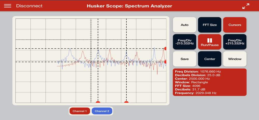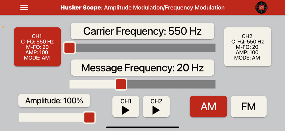 Husker Scope provides an all-in-one cross platform application that implements a Dual Channel (DC) Function Generator, DC AM/FM Modulator, DC Oscilloscope, and a DC Spectrum Analyzer functionality for use within UNL engineering courses and around the world. This app outputs audio range (20Hz to 20,000Hz) signals via the speakers / 3.5mm audio jack left & right channels and inputs signals via the microphone input within the audio range.