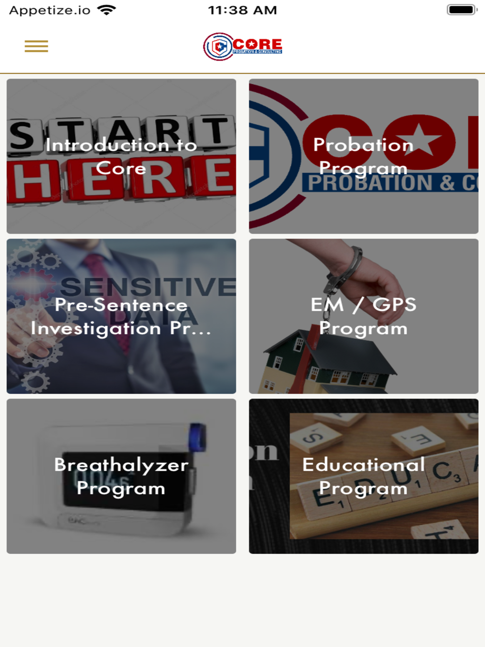 App is designed with features to give people the necessary tools needed to become successful through challenges faced in your life. Learn about community service opportunities in your area. If you need to contact Core Probation and Consulting staff the contact information is provided as well as the direct link to the Core Website. This App has many solutions for some of communication difficulties that is why a communication section is in the application. Please let Core Probation Staff know if there is anything we need to improve upon. Start by sending an email to,