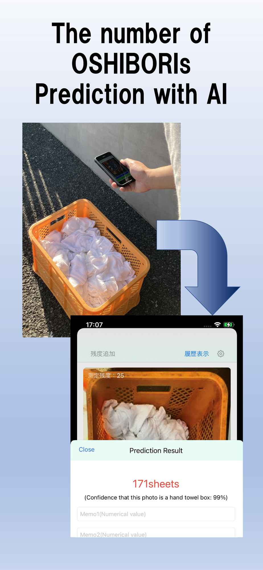 - AI in this app will predict the number of OSHIBORIs (Japanese OSHIBORIs) collected in a box.