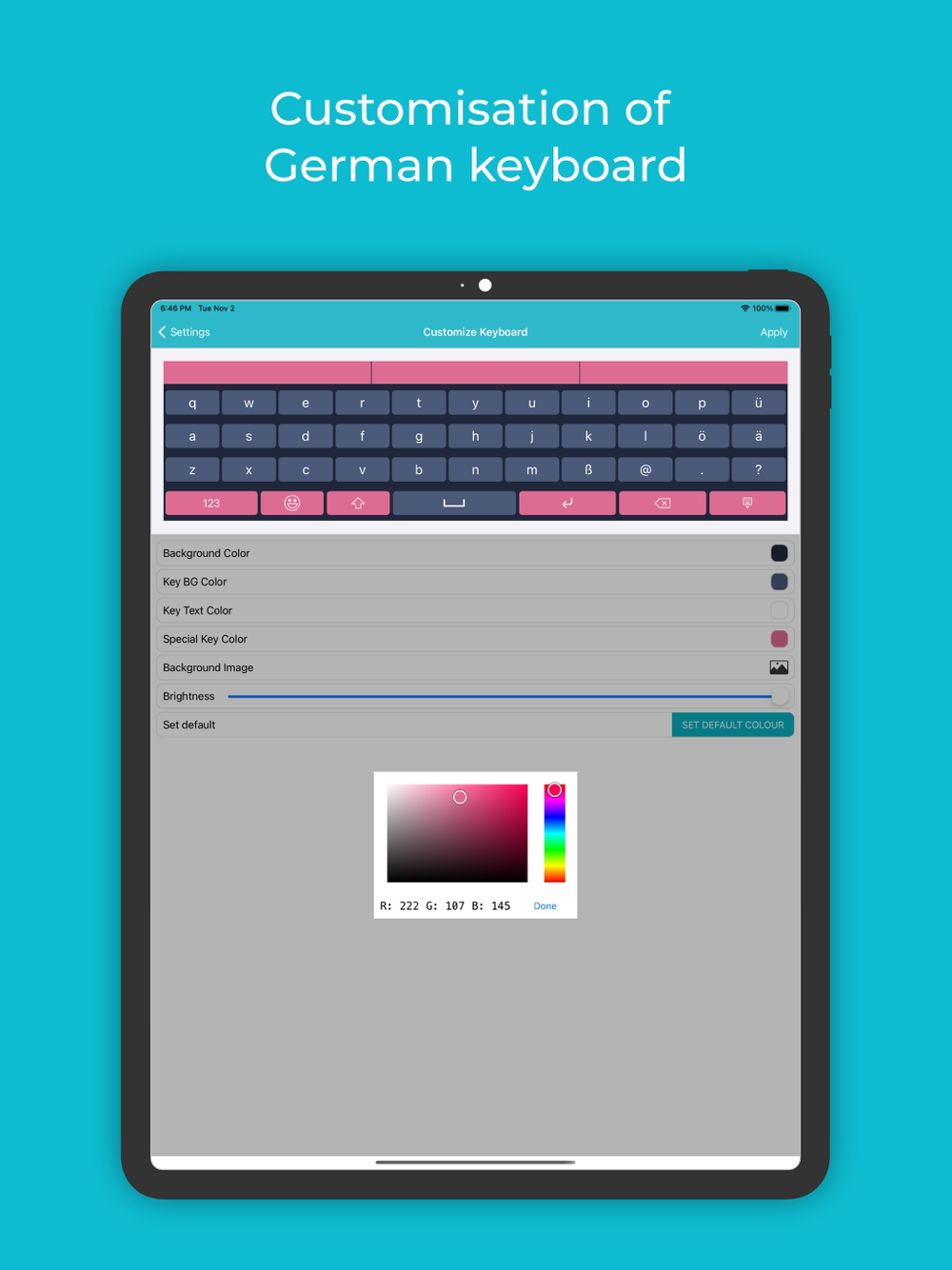 • Change colours for the Background colour, Key background colour, Keyboard text colour, Suggestion box colour etc, so that typing does not seem boring and monotonous with this German keyboard for iOS.