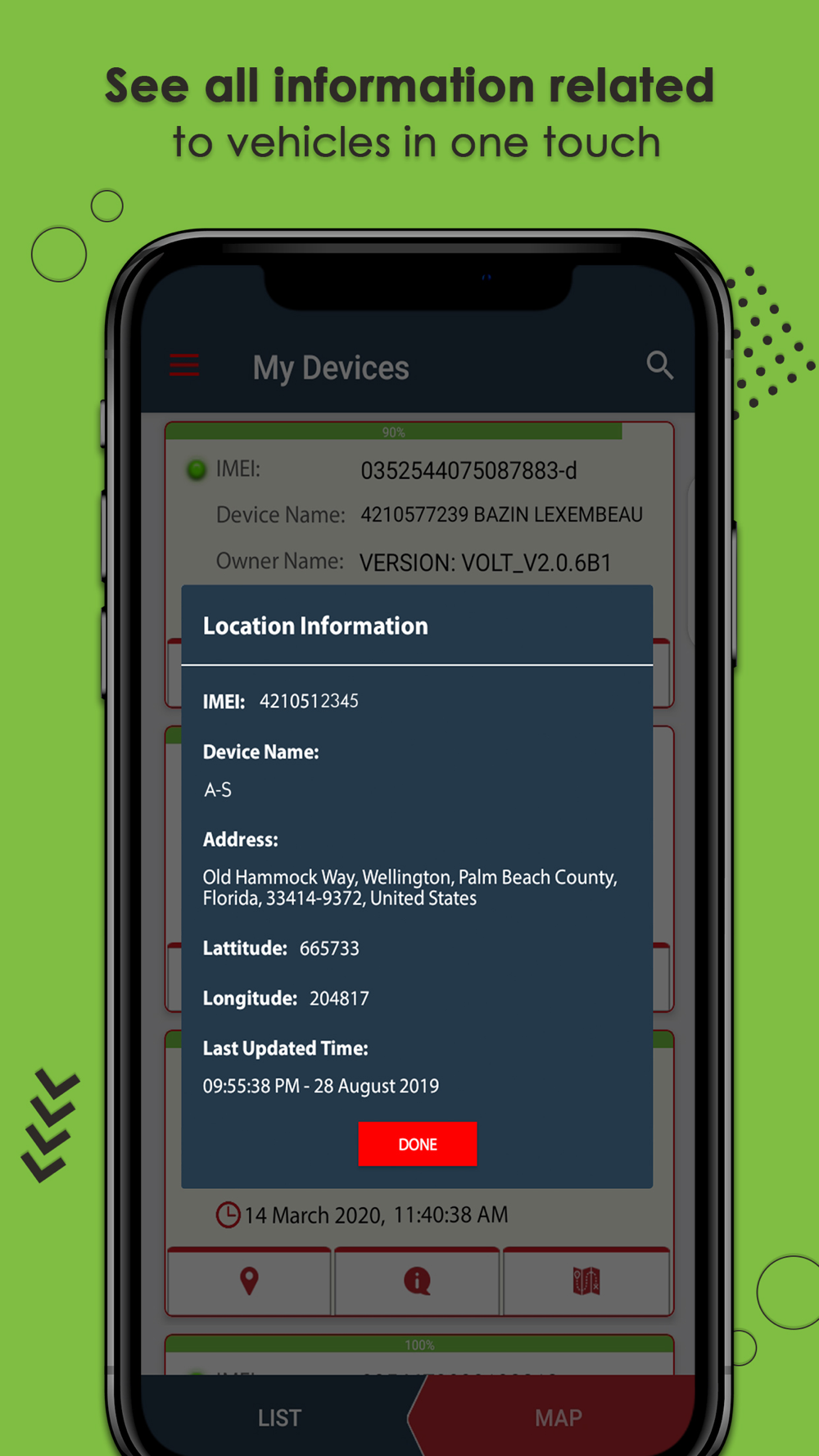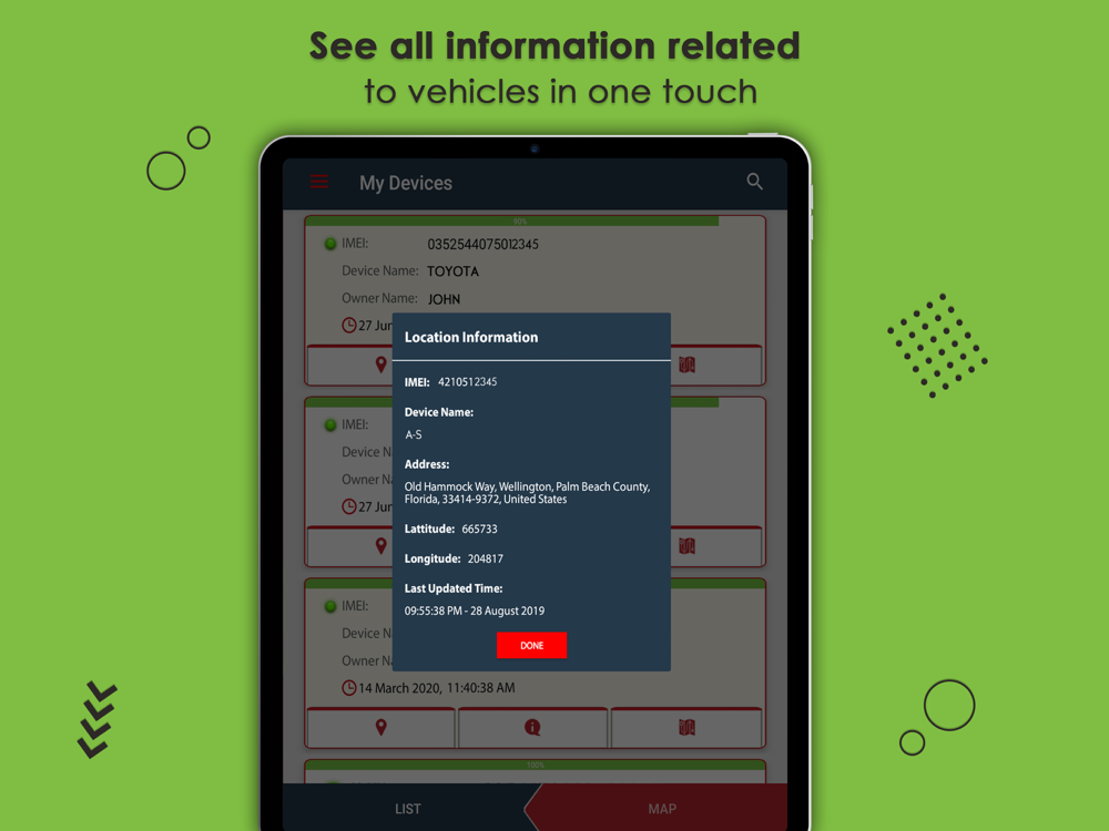 • Get details about the vehicle in use such time of journey, GPS Battery level & signal strength