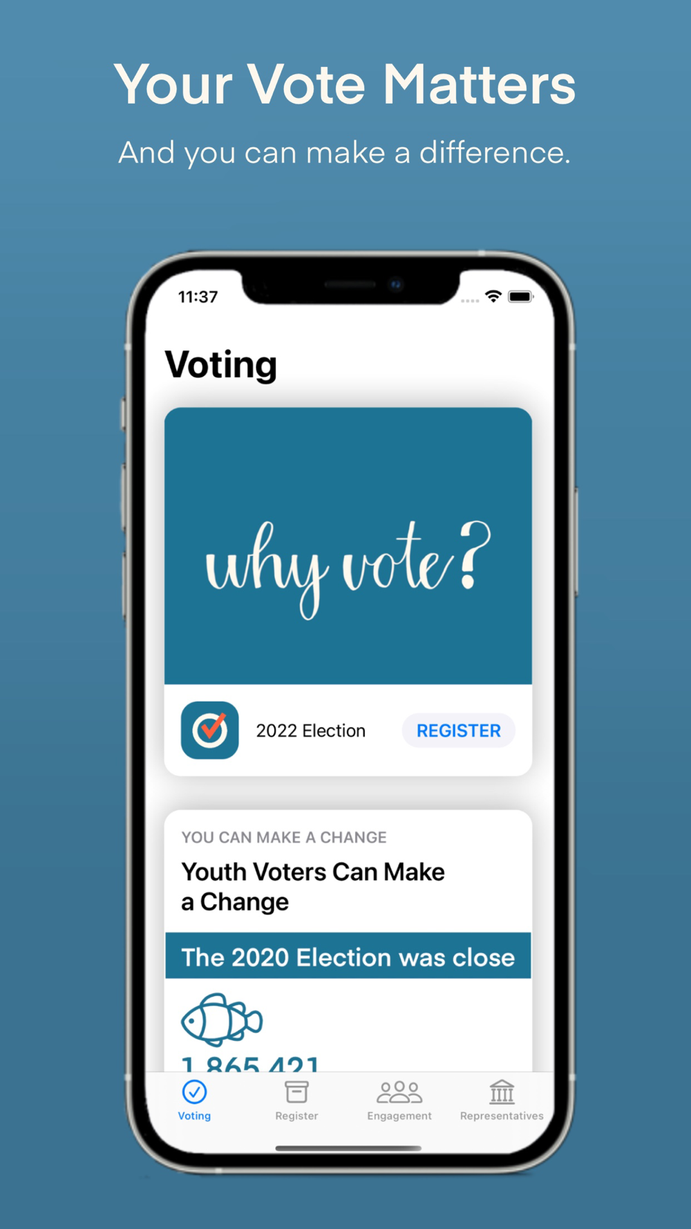 YouthVoter is aimed at mitigating the hurdles of voting for youth voters by encouraging voting and political engagement, providing the resources to register to vote, and displaying information on the user’s local representatives.