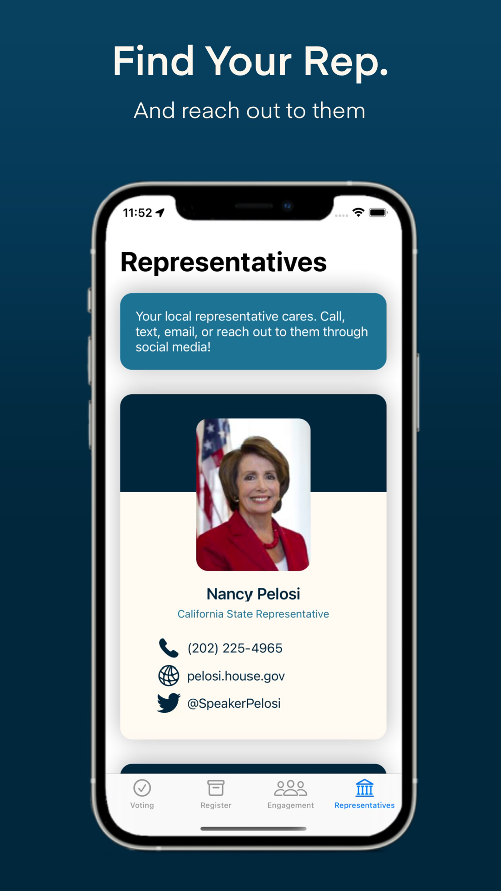 - Displays your house and senate representatives along with their phone number, email, and Twitter information