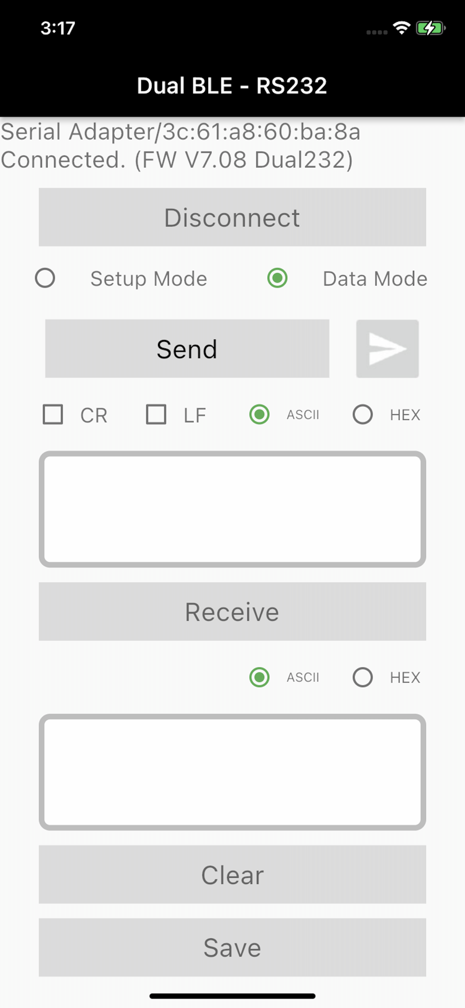 The iOS portable devices will connect with the Bluetooth Low Energy (BLE) to serial port converter devices and exchange data with them bi-directional. The serial port includes RS-232 or RS-422 RS-485 interfaces. The user will test the APP with the SCADA, Robot, UAV, PLC, CNC or etc. with the BLE to serial port devices. The APP will be customized to meet the specific applications.