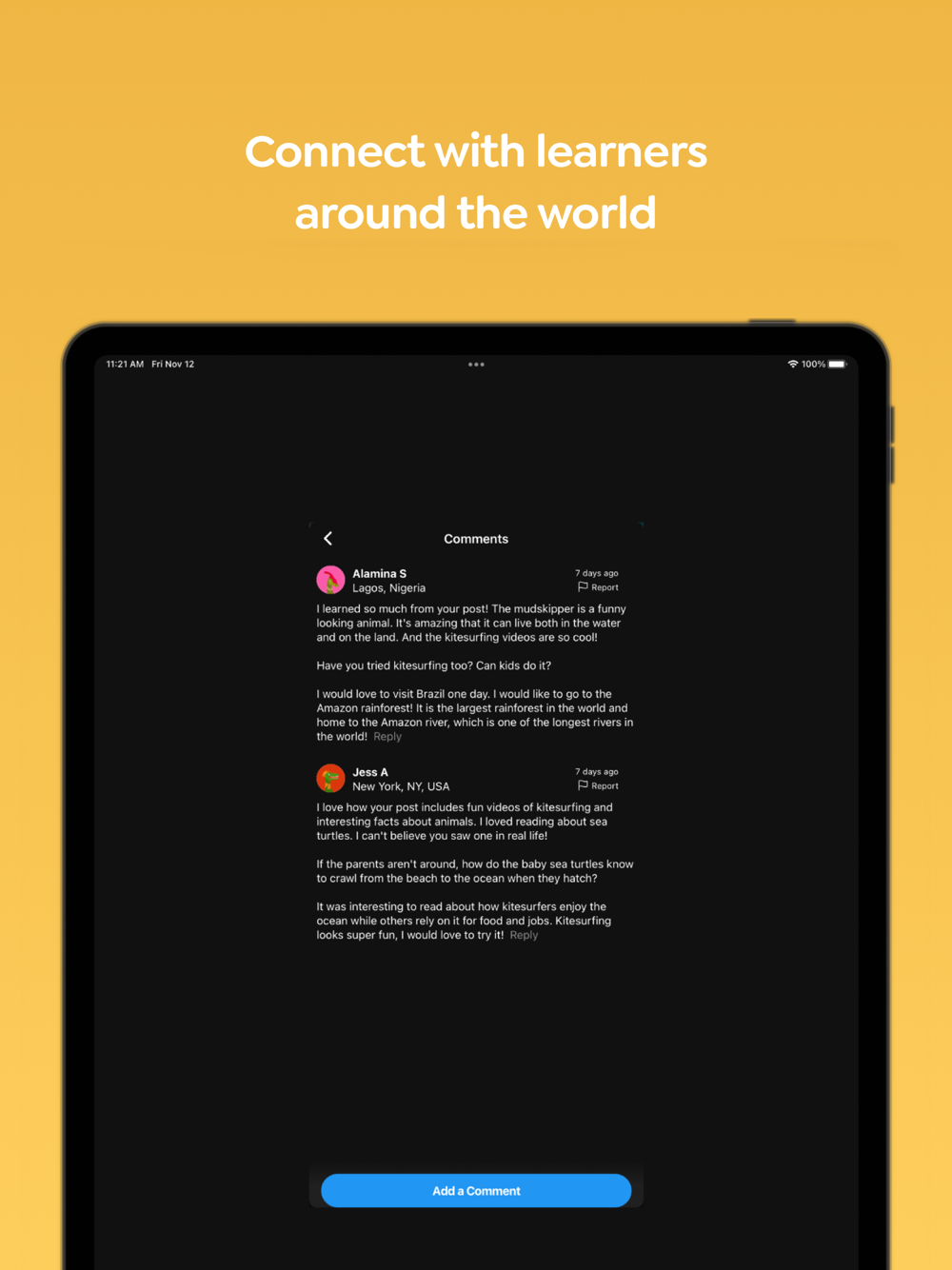 With Go Pangea, learners of all ages respond to questions related to world cultures, history, art, literature, food, science, math, and much more. Learners respond by creating posts using videos, images, and text. Learners can comment on other posts to share their ideas and perspectives.