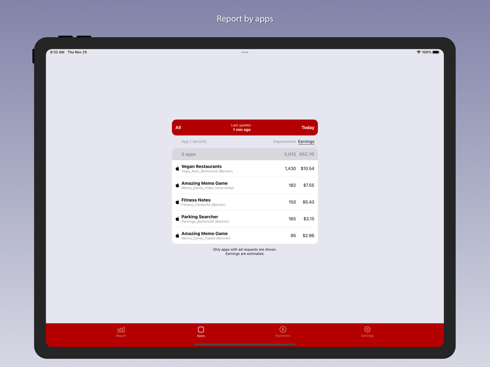 - Report by applications in a given period. Check what you are earning in each application. Includes filter by operating system.