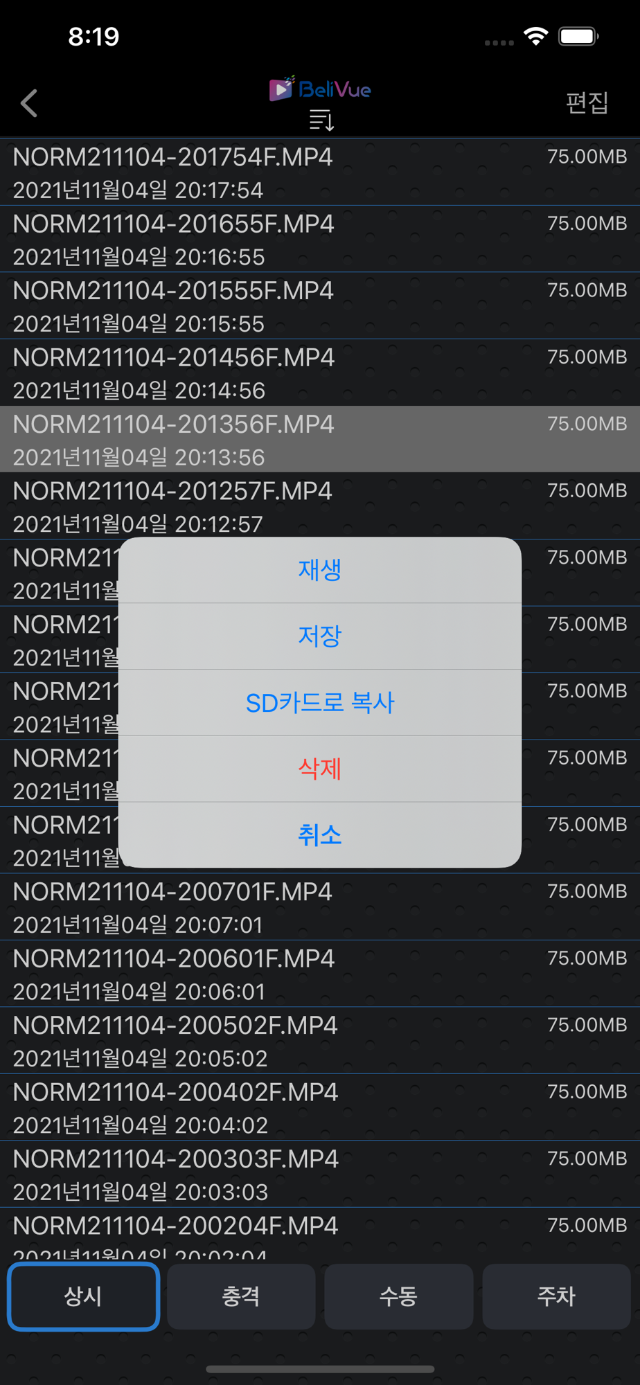 또한 녹화장치(내장메모리 또는 SD카드)에 녹화된 영상을 스마트 폰에 저장하고 재생할 수 있으며 오래된 파일을 제거 할 수 있습니다.