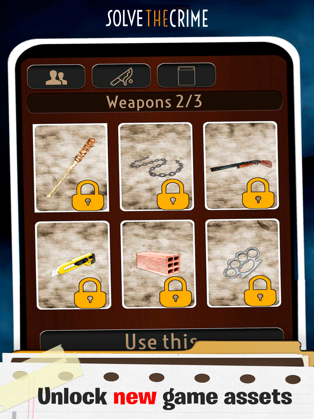 Candlestick, Dagger, Lead pipe, Revolver, Rope, Spanner, Chainsaw, Brick, Cutter, Shotgun. Unlock all weapons!