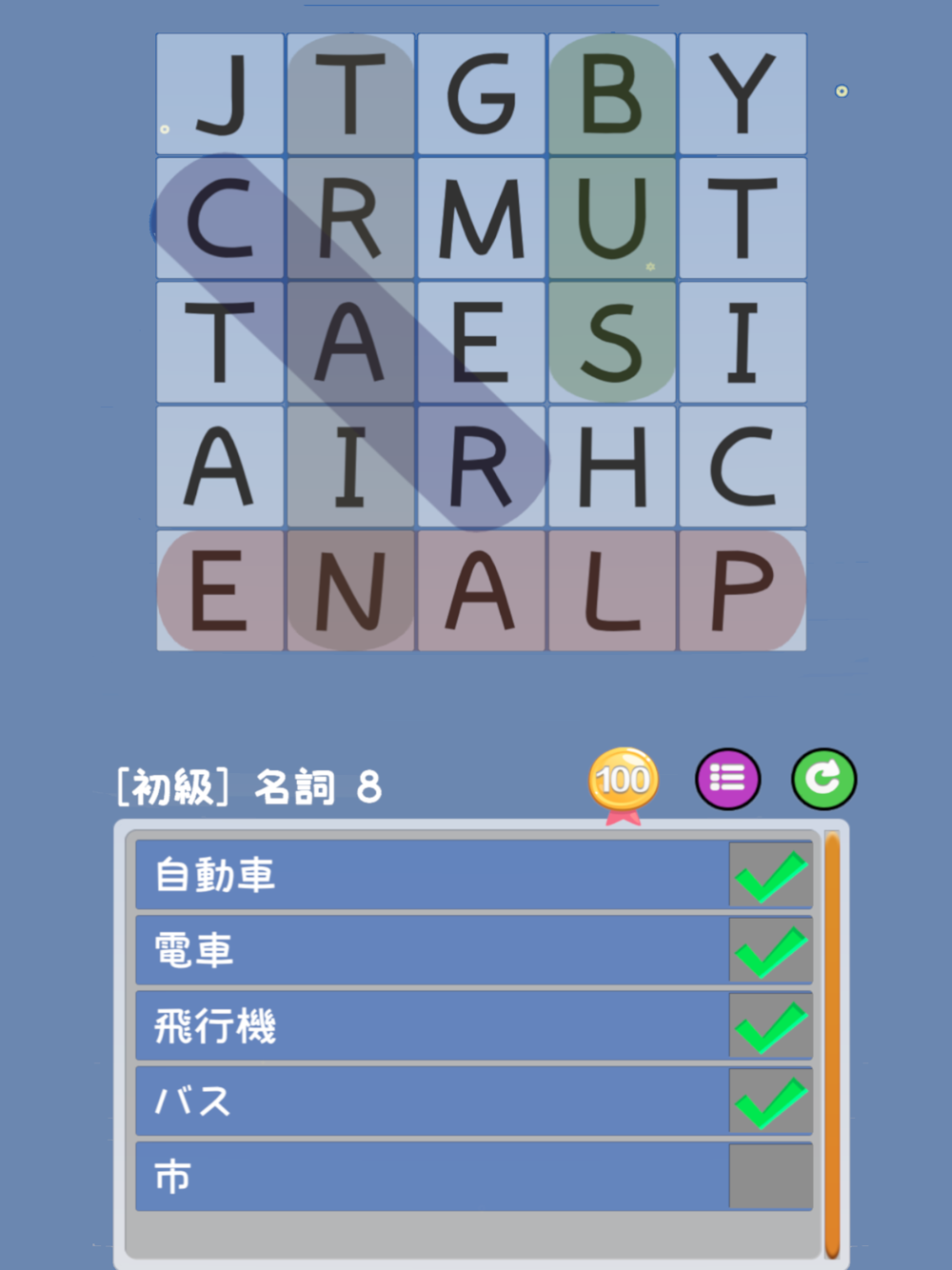 英単語は、→(左から右)、←(右から左)、↓(上から下)、↑(下から上)、↘(左上から右下)、↗(左下から右上)、↙(右上から左下)、↖(右下から左上)の8方向に並んでいます。また、ゲームクリア数が増えるに連れて複雑に配置され、他の英単語のスペルと重なっている場合もあります。