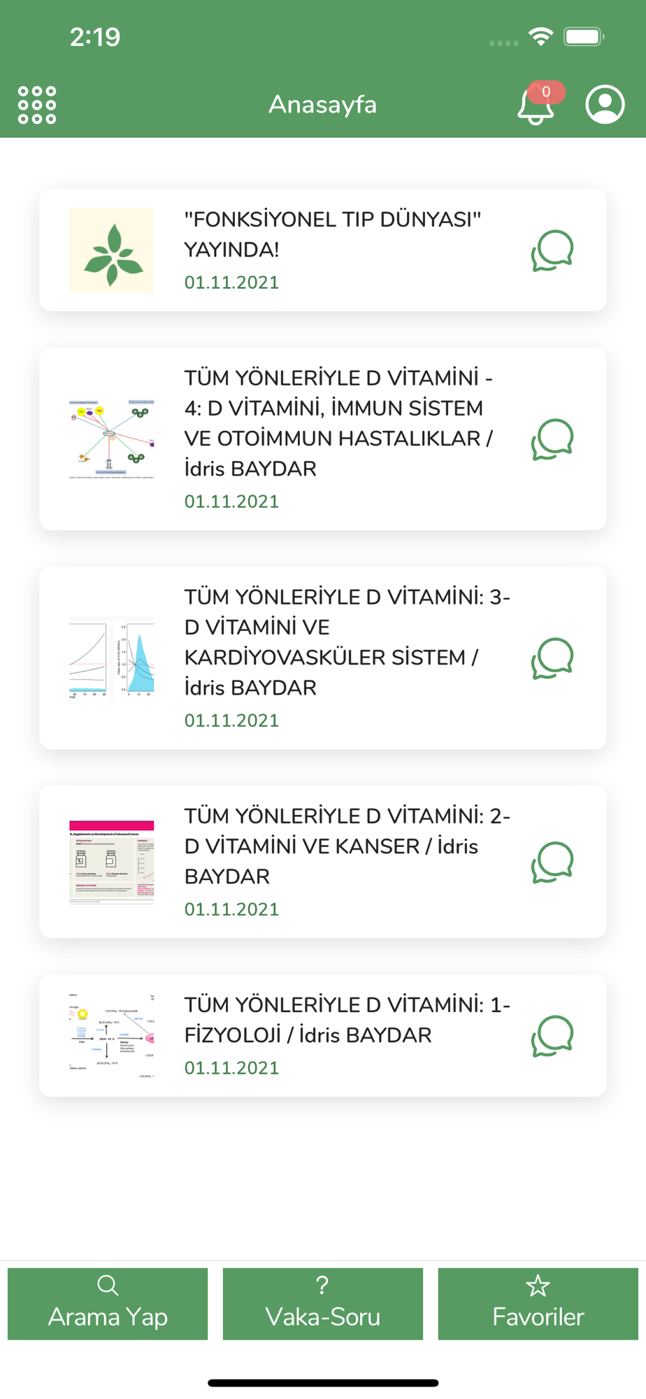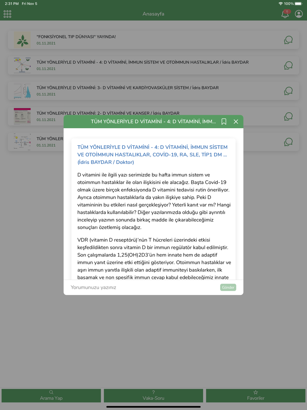 Vaka-bilgi-deneyim paylaşımı: Diğer fonksiyonel tıp uygulayıcılarının ilginç vakalarını paylaşabileceği, sizin vakanıza yorum veya katkıda bulunabileceği bir platform olacak. Bu sayede kafanıza takılan herhangi bir soruyu sorabilecek, diğer kullanıcıların cevaplarını alabileceksiniz. Veya başka soru ve cevapları da inceleyip deneyim kazanabilirsiniz.